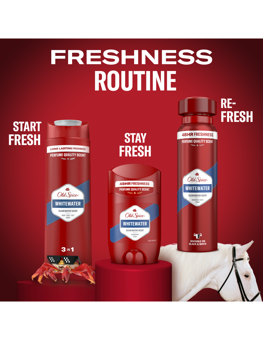 Ööpäevaringne värsssskussss* ja heast lõhnast tulev enesekindlus tänu pulkdeodorandile Old Spice Whitewater. Selle muretu värskusega saad püüelda kõrgemate eesmärkide poole, näiteks sõlmida tulusaid kokkuleppeid või õpetada delfiine kõnelema. Proovi pulkdeodoranti tugevaks kaenlaaluseks kaitseks kuiva ja lihtsa pealekandmisega (võrreldes Old Spice’i spreideodorandiga). Päästa valla kolmekordne Active Defence’i koostis. püsiv lõhn / kaitse ebameeldiva lõhna eest / ebameeldiva lõhna teket takistavad ained, et lõhnaksid nagu tõeline legend kogu ööpäeva* Värskete vete, sandlipuu-, tsitruse- ja ambranootide kosutav aroom paneb sind lõhnama sama vastupandamatult kui sireenide laul. Ja mainimata on veel jäänud see, et deodorant ei sisalda alumiiniumsoolasid ning jääb musta ja valget värvi riietel märkamatuks. Aga nii see on. * igapäevasel kasutusel.