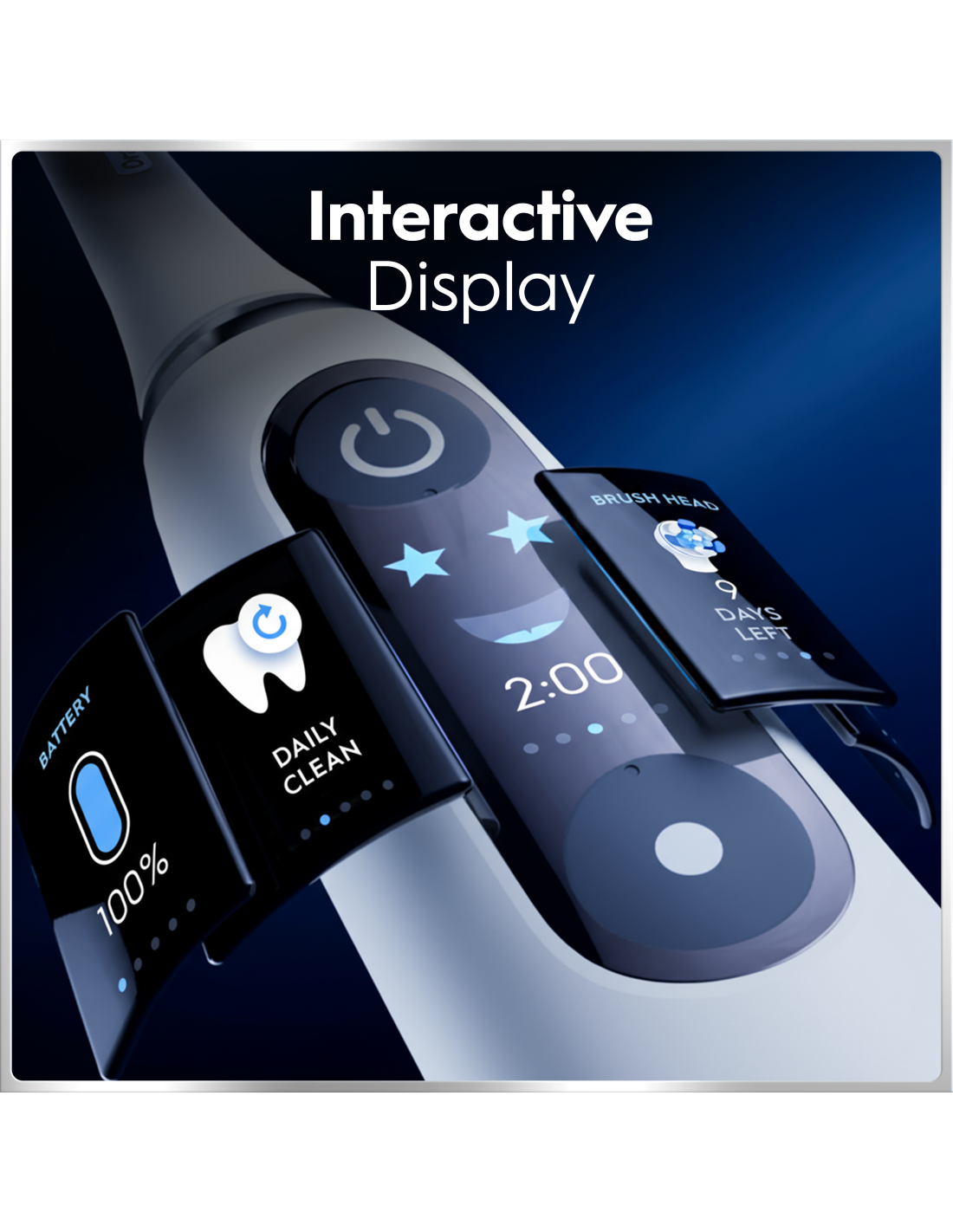Interaktiivne mustvalge ekraan näitab 5 harjamisrežiimi, laadimise edenemist ja 2-minutilist harjamistaimerit.