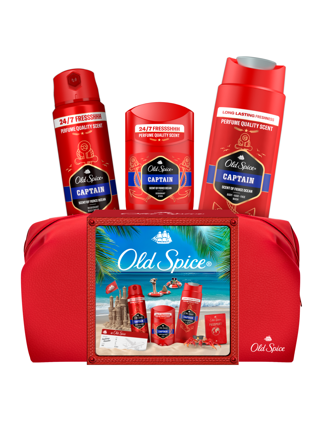 Reisikotis olev kinkekomplekt sisaldab Captain kuiva deodoranti, pihustatavat deodoranti ja meeste dušigeeli, mis kõik on pakitud erilisse Old Spice’i kosmeetikakotti. Seda saab korduvalt kasutada, et võtta kaasa tualett-tarbeid reisile või treeningule. Old Spice Captain’i kvaliteetne aroom ei vea sind alt: võimsate ookeanilainete, sandlipuu ja mahlaka bergamoti lõhn muudab sind kartmatuks värskuse kapteniks.