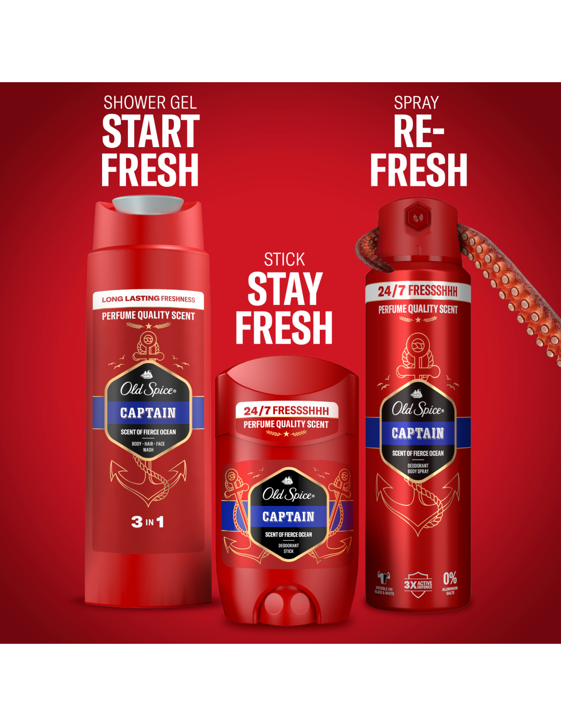 proovi Old Spice Captain’i kvaliteetset aroomi: võimsate ookeanilainete, sandlipuu ja mahlaka bergamoti lõhn muudab sind kartmatuks värskuse kapteniks