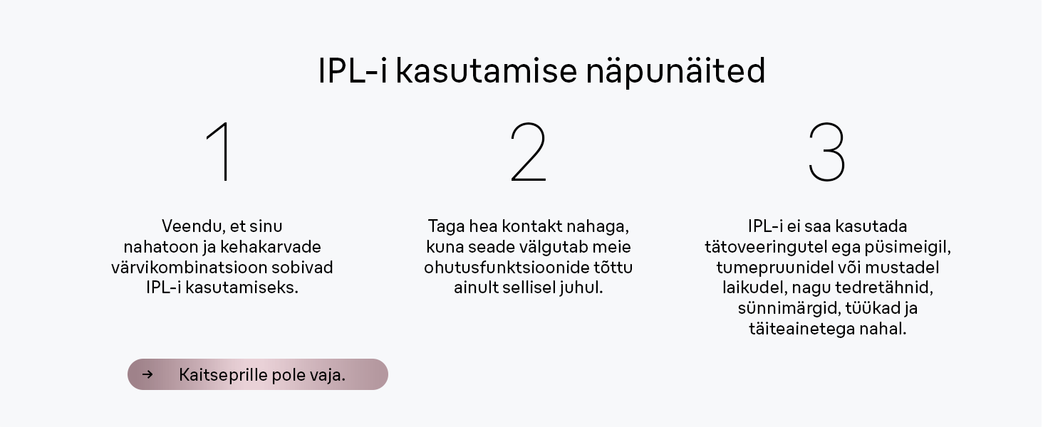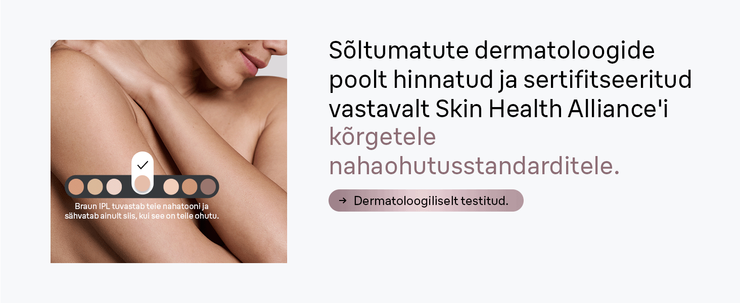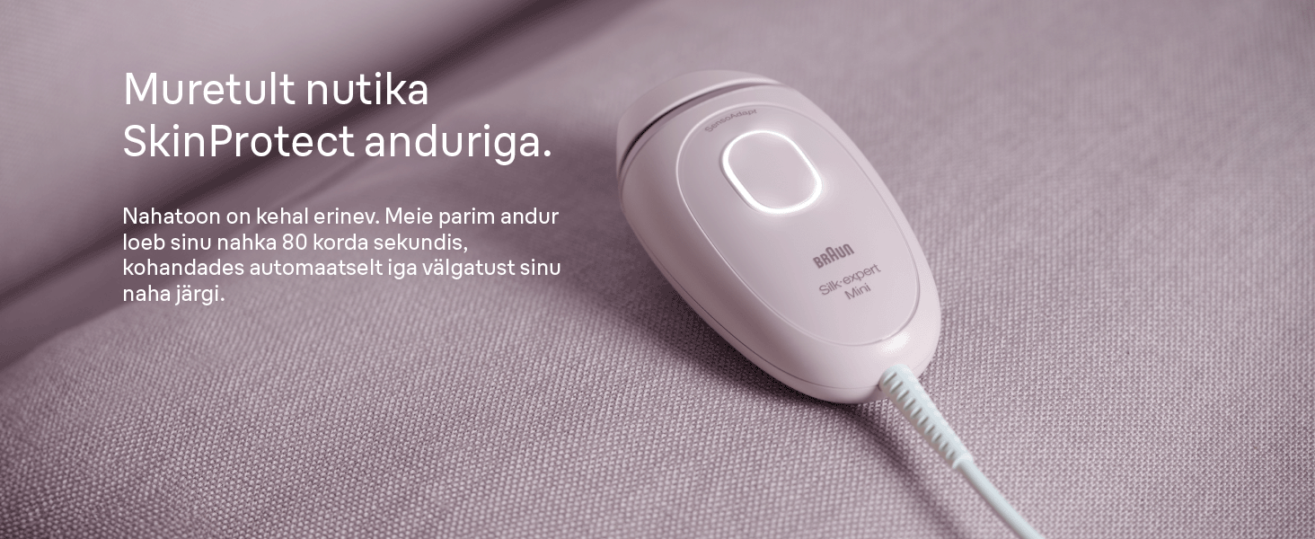 Seadmel on SkinProtect andur, mis tuvastab sinu nahatooni ja kohandab automaatselt sobiva võimsuse. Nahale õrn impulssvalgus tagab turvalise ja mugava kasutamise.