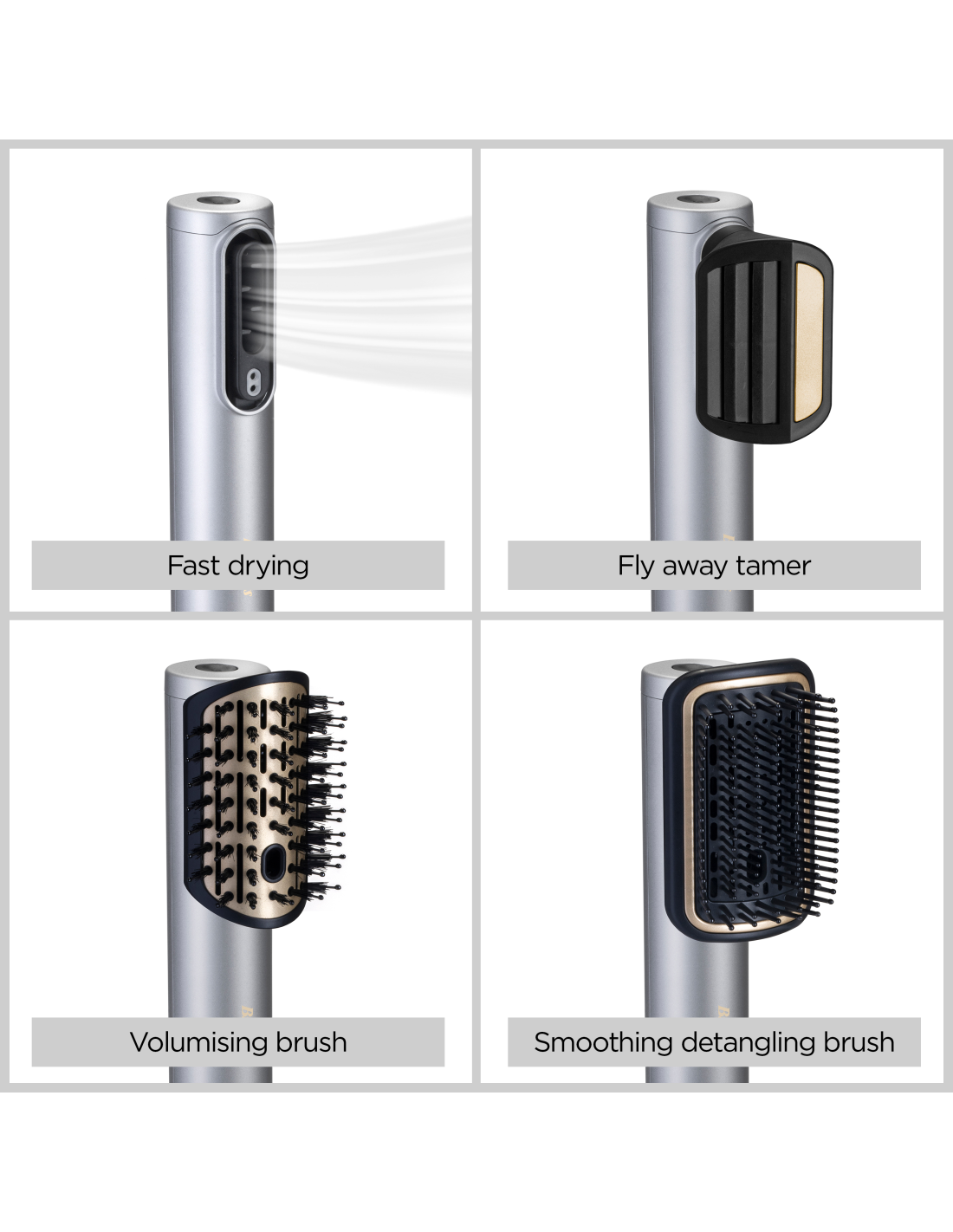 BaByliss Air Wand AS6555E on universaalne 4-ühes stiiler, mis samaaegselt kuivatab, sirgendab, lisab volüümi ja taltsutab sõnakuulmatuid juukseid. See töötab õrnalt, kaitstes tundlikke juuksesalkusid ning tagades särava, sileda tulemuse ilma kahususeta