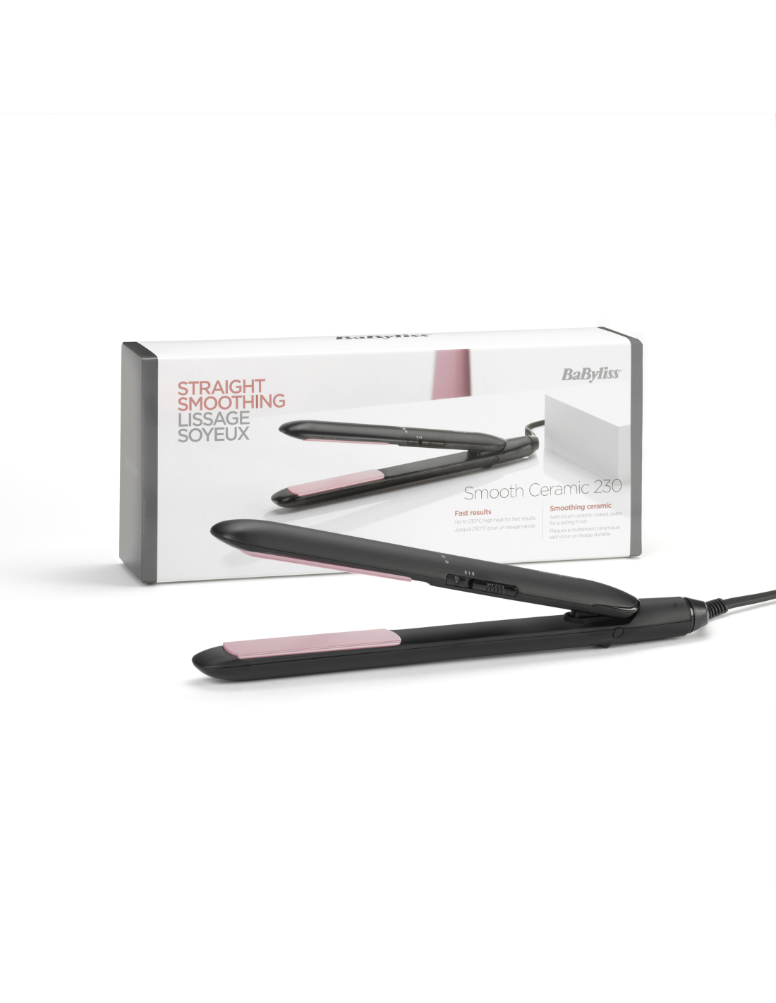 Juuksesirgendaja Smooth Ceramic 230 on atlassilise kattega, sujuvate keraamiliste plaatidega ning kahe temperatuuriseadistusega, maksimaalse temperatuuriga 230°C, et tagada lihtne ja kontrollitud soeng ja sile tulemus kõigil juuksetüüpidel.