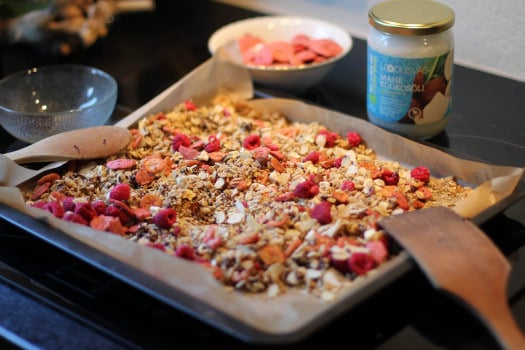 Kata ahjuplaat küpsetuspaberiga ja laota sellele võimalikult ühtlaselt jaotatuna müslisegu. Rösti segu 160 kraadises ahjus 10-15 minutit, aeg-ajalt segades. Seejärel tõsta plaat ahjust ja oota kuni müsli jahtub. Sega juurde külmkuivatatud ÖKO vaarikad, maasikad ja kuivatatud banaanid. Naudi koos taimse piima või jogurtiga! Lisa krõmpsu andmiseks täienda oma maitse järgi seemnete ja purustatud sarapuu pähklitega.