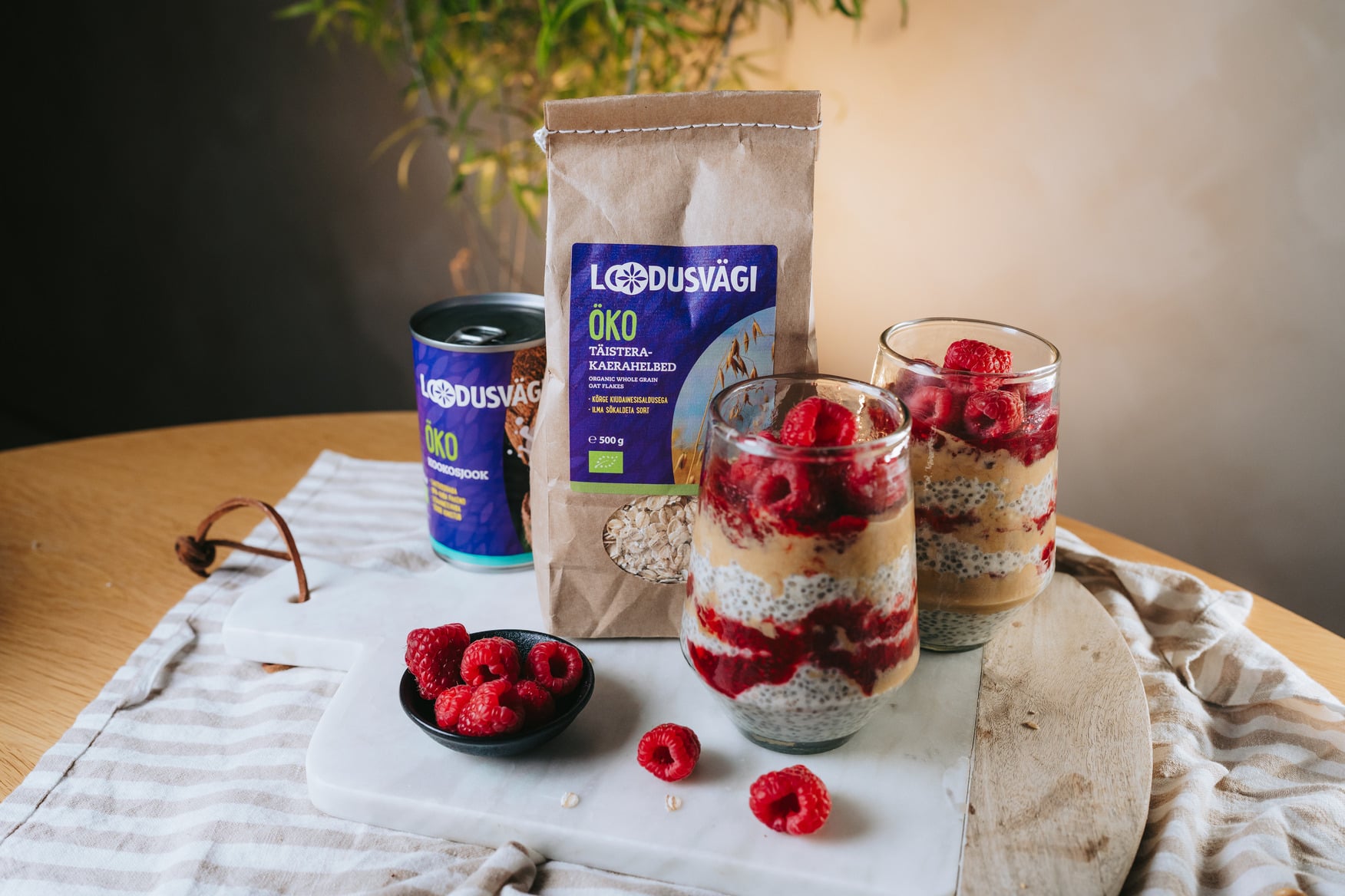 Võta paraja suurusega klaasid ning lisa kihiti üleööhelbed, vaarikamoos ja maapähklivõi.