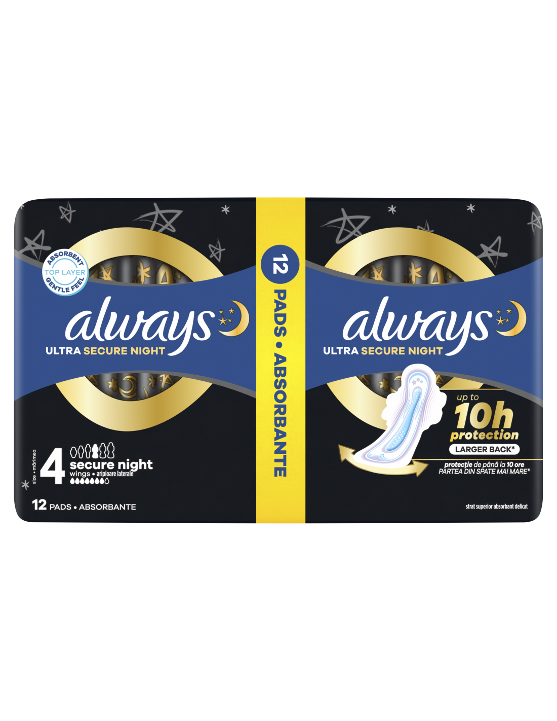 Ära lepi magades vähema kui hea unega tänu kuni 10-tunnisele kaitsele: tiivakeste ja imava õrna pealiskihiga hügieenisidemel ALWAYS Ultra Secure Night (suurus 4) on kolm kaitsvat omadust, nii et sa ei pea lekete kontrollimiseks üles ärkama ega sidet poole öö pealt välja vahetama. 60% suurem tagaosa (võrreldes hügieenisidemega Always Ultra Normal, suurus 1) ja LeakGuard-tehnoloogia lukustavad vedeliku sidemesse ning aitavad vältida menstruatsiooni ajal öiseid lekkeid ja lõhnu. Always Ultra hügieenisidemed on saanud nahatervise organisatsiooni Skin Health Alliance dermatoloogilise heakskiidu.