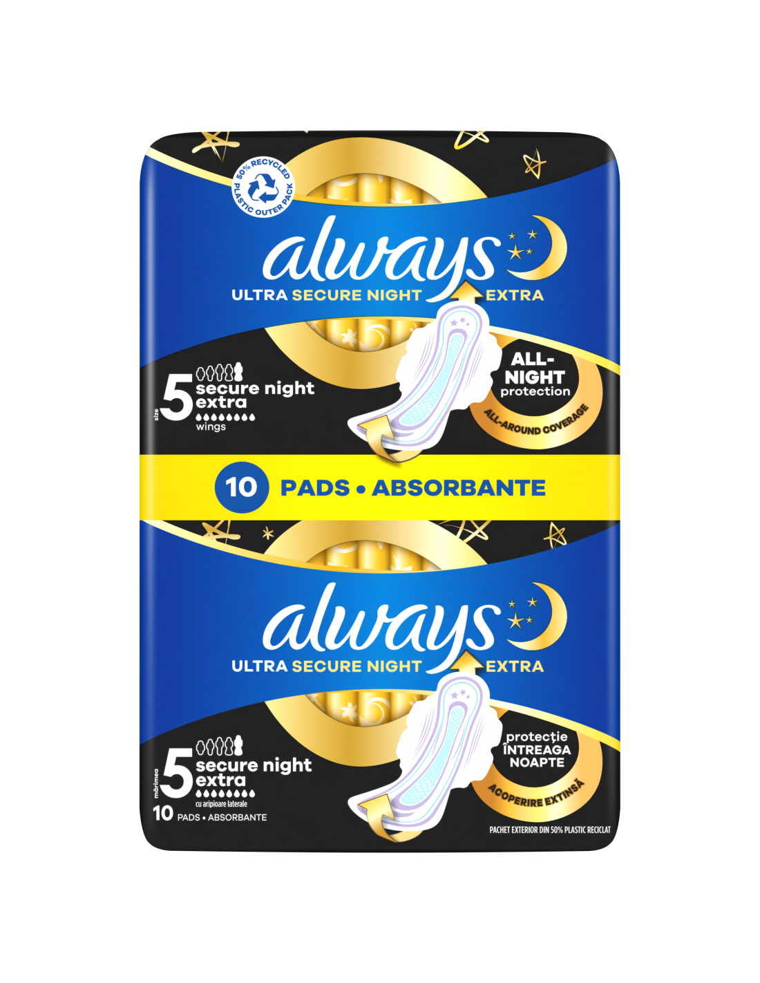 Ära lepi magades vähema kui katkematu unega tänu kuni 12-tunnisele kaitsele: tiivakeste ja imava õrna pealiskihiga hügieenisidemel ALWAYS Ultra Secure Night Extra (suurus 5) on kolm kaitsvat omadust, nii et sa ei pea lekete kontrollimiseks üles ärkama ega sidet poole öö pealt välja vahetama.  9% suurem esiosa ja 85% suurem tagaosa (võrreldes hügieenisidemega Always Ultra Normal, suurus 1) koos LeakGuard-tehnoloogiaga tagavad menstruatsiooni ajal täieliku öise kaitse lekete vastu. Always Ultra hügieenisidemed on saanud nahatervise organisatsiooni Skin Health Alliance dermatoloogilise heakskiidu.
