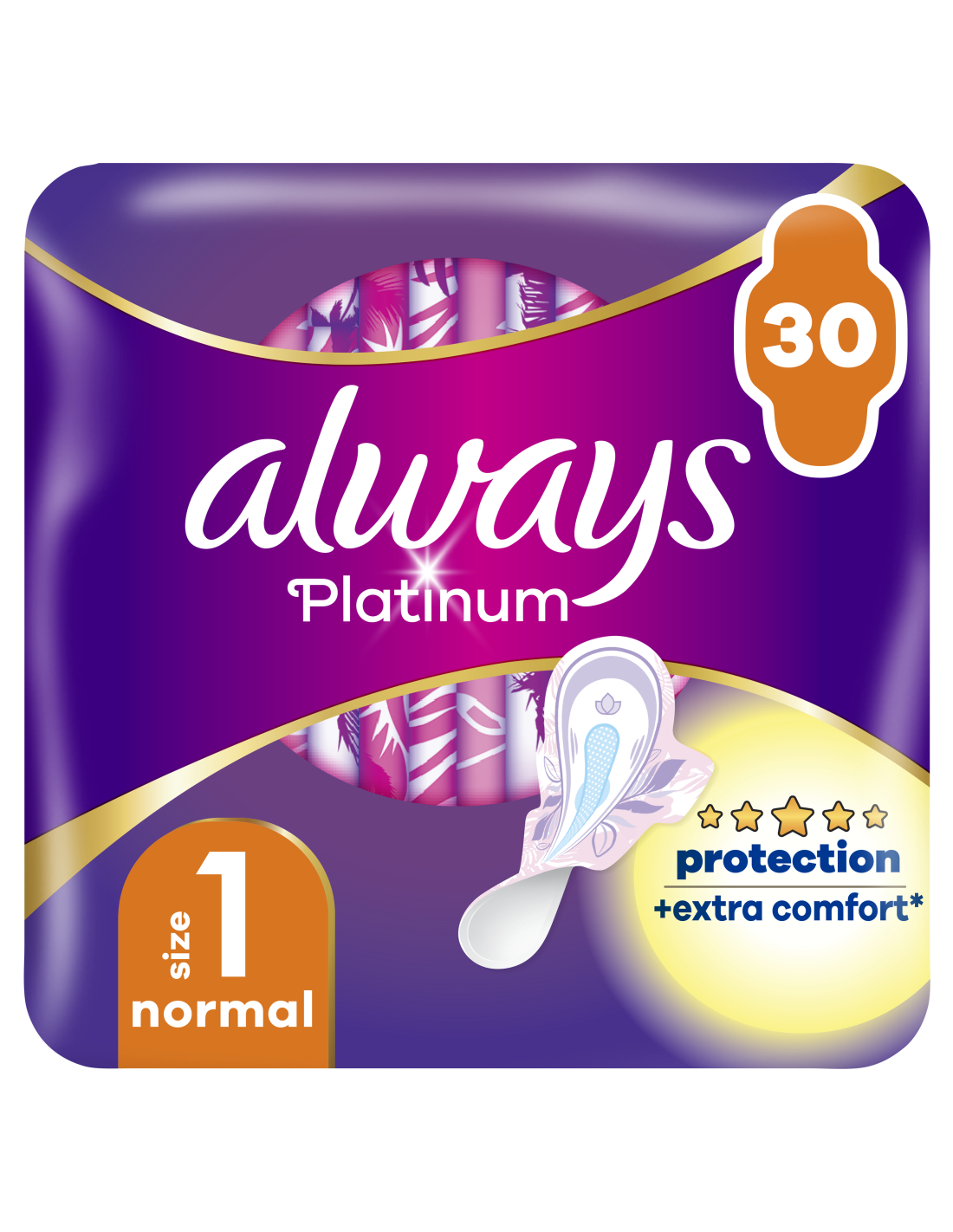 ComfortLock-tiivakestega hügieeniside Always Platinum on loodud senisest paremaks sobitumiseks*, et ennetada lekkeid, sideme nihkumist ja ebamugavustunnet. Kui kasutad hügieenisidet Always Platinum, pole sul üldse vaja päevade peale mõelda. Tiivakestega hügieenisidet Always Platinum Normal (suurus 1) soovitame päevaseks kasutamiseks vähese või keskmise vereerituse korral. Proovi hügieenisidet Always Platinum Secure Night Extra (suurus 5), Always Platinumi parimat hügieenisidet öiseks kaitseks. * võrreldes eelmise tootega.