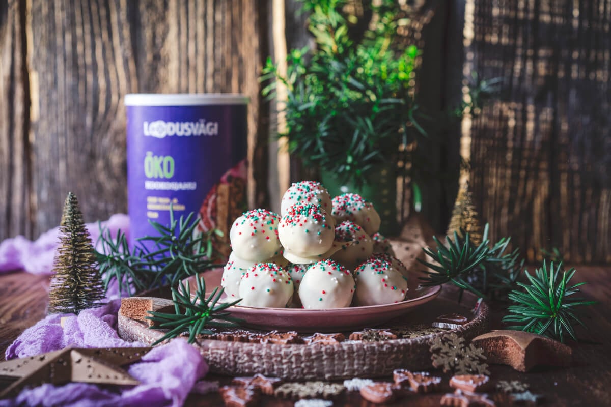 Sega kõik koostisosad peale valge šokolaadi kokku. Vormi massist pallikesed. Sulata šokolaad ja kasta pallikesed šokolaadi sisse ning kaunista. Pane külmkappi tahenema ja lase heal maitsta.