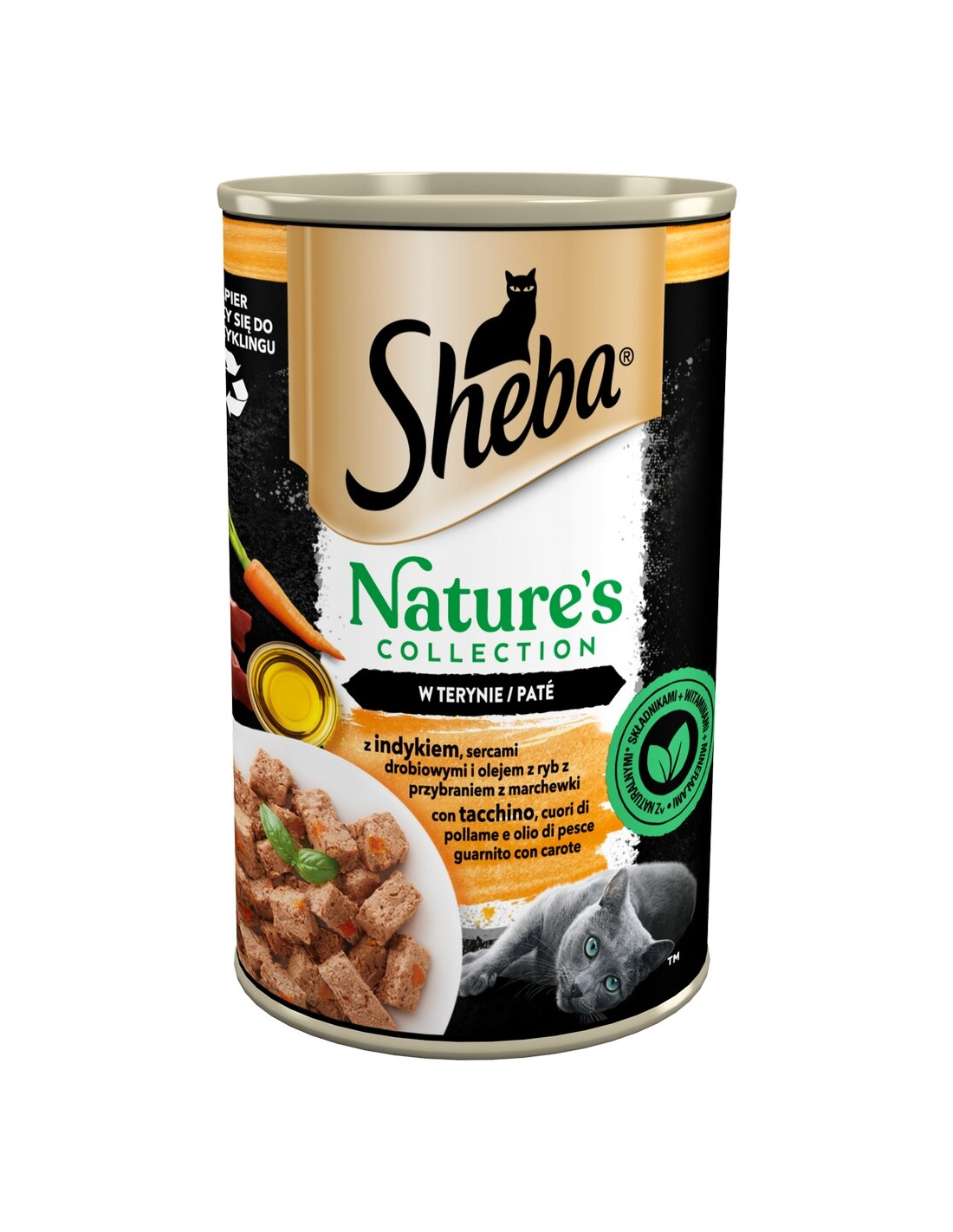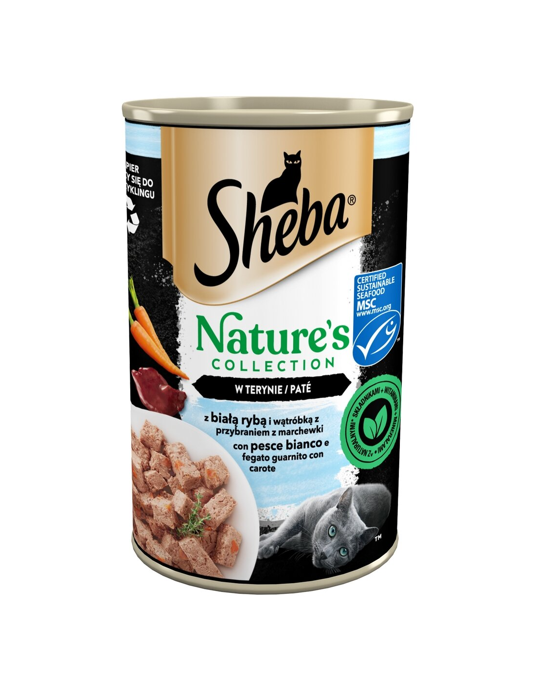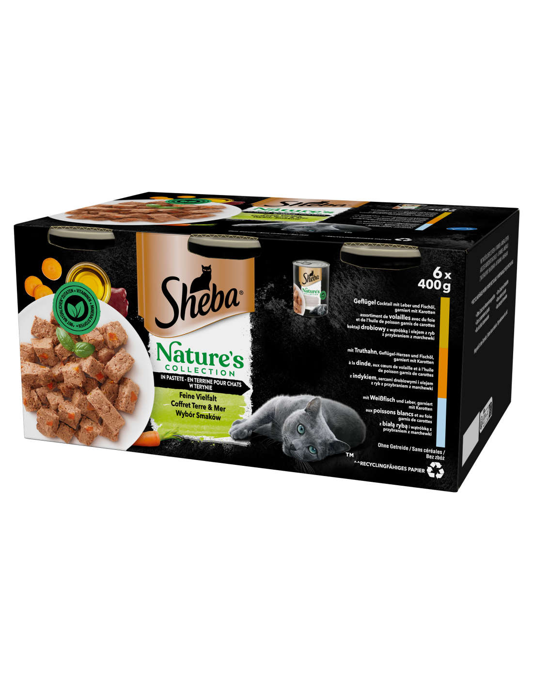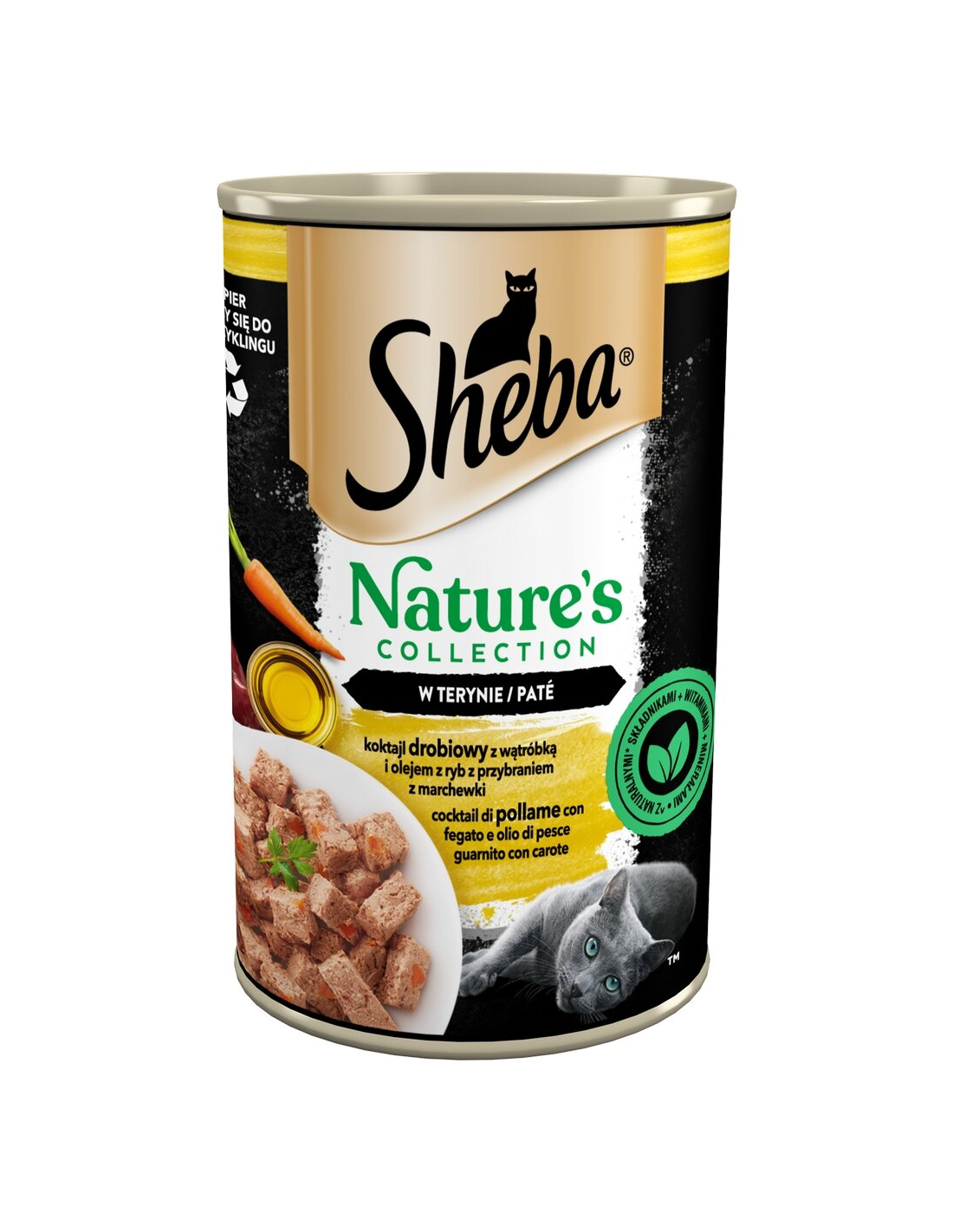 Sheba Nature's Collection retsepti saladus peitub hoolikalt valitud kvaliteetsetes looduslikes koostisosades, vitamiinides ja mineraalides. SHEBA® Nature's Collection toidud sisaldavad kalaõli, mis on loomulik Omega-3 rasvhapete allikas, ja porgandit, mis on looduslik antioksüdantide ja kiudainete allikas. Need maitsvad toidud ei sisalda teravilja, kunstlikke maitseaineid ega värvaineid.