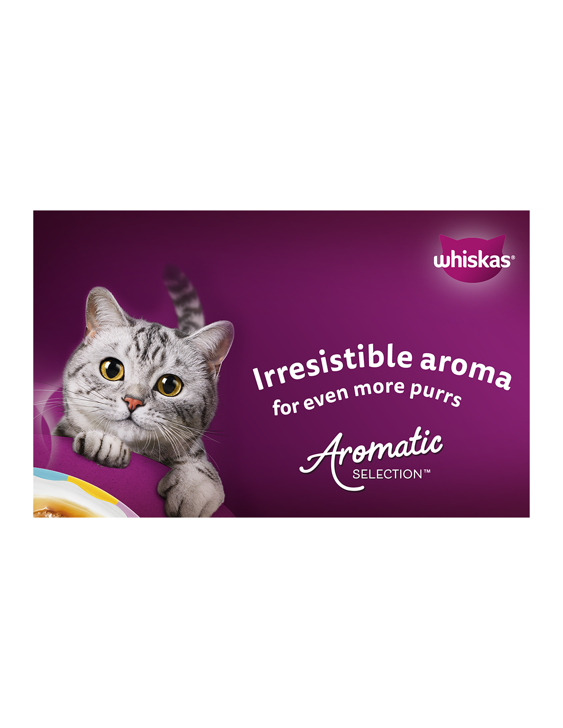 80% maitsest tuleb lõhnast ja seepärast oleme loonud maailma täiuslikest ja aromaatsetest Whiskas Aromatic Mix toitudest, mis meelitavad teie lemmiklooma iga kord kausi juurde.