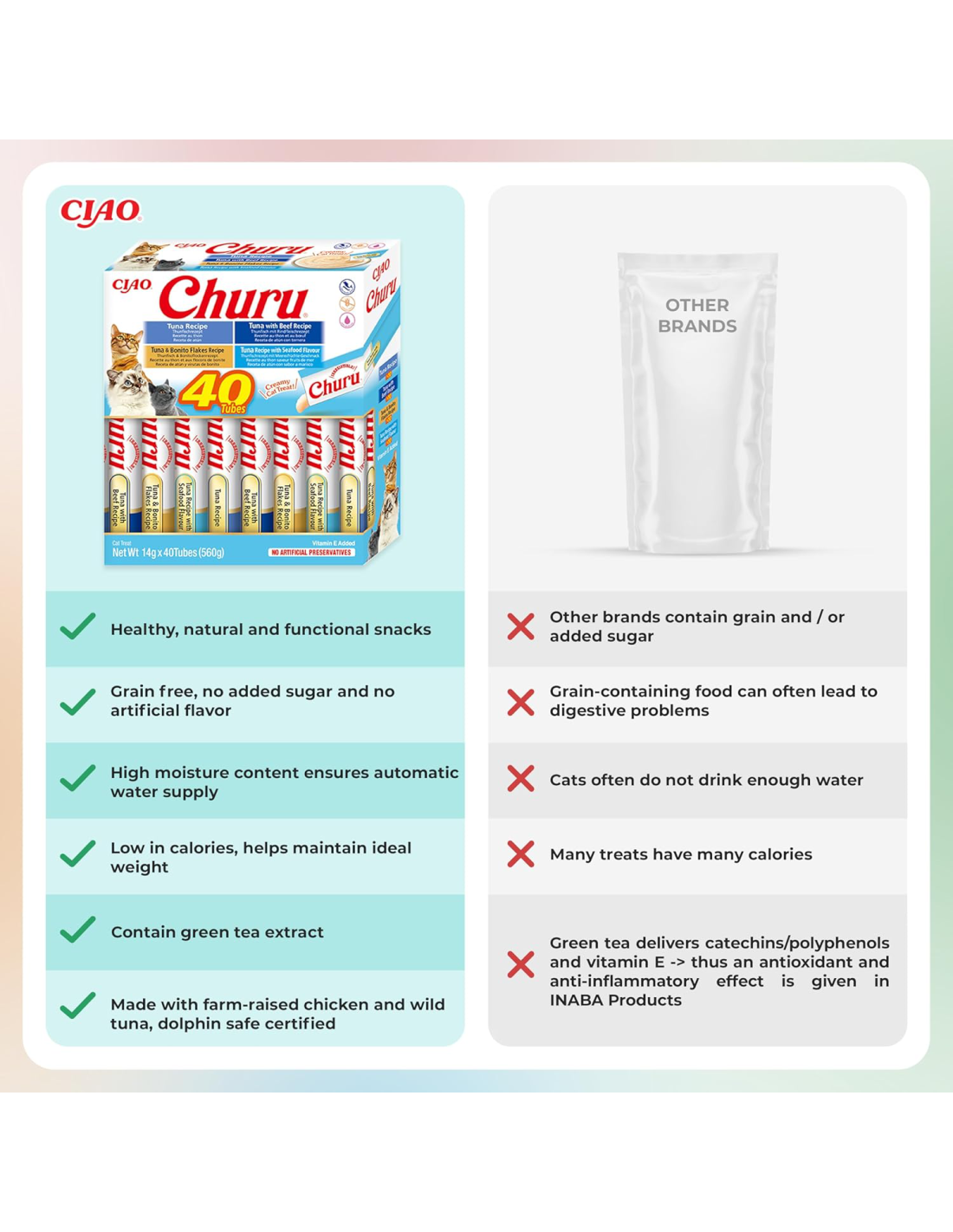 Churu maiused on madala kalorsusega, teravilja- ja säilitusainetevabad ning valmistatud hoolikalt jälgitavates farmides loomulikult kasvatatud vabapidamisel kanadest ja säästvalt püütud, sertifitseeritud ja delfiinidele ohutu süvamere tuunikalaga.