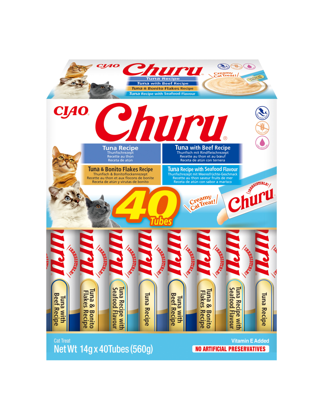 INABA CAT CHURU Variety Tuna 40x 14g  on spetsiaalselt valitud maiuste kogu teie kassile, millel on imeline tuunikala maitse. Hoolikalt valitud koostisosad tagavad, et iga portsjon pakub teie kassile nii intensiivset maitset kui ka olulisi toitaineid.