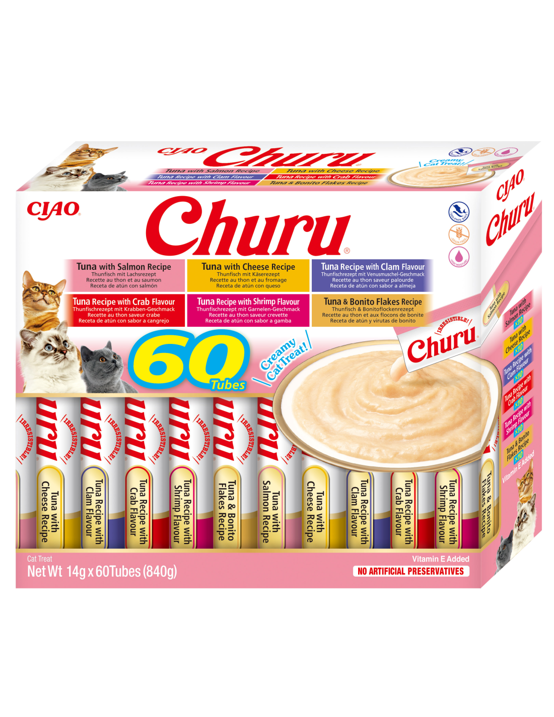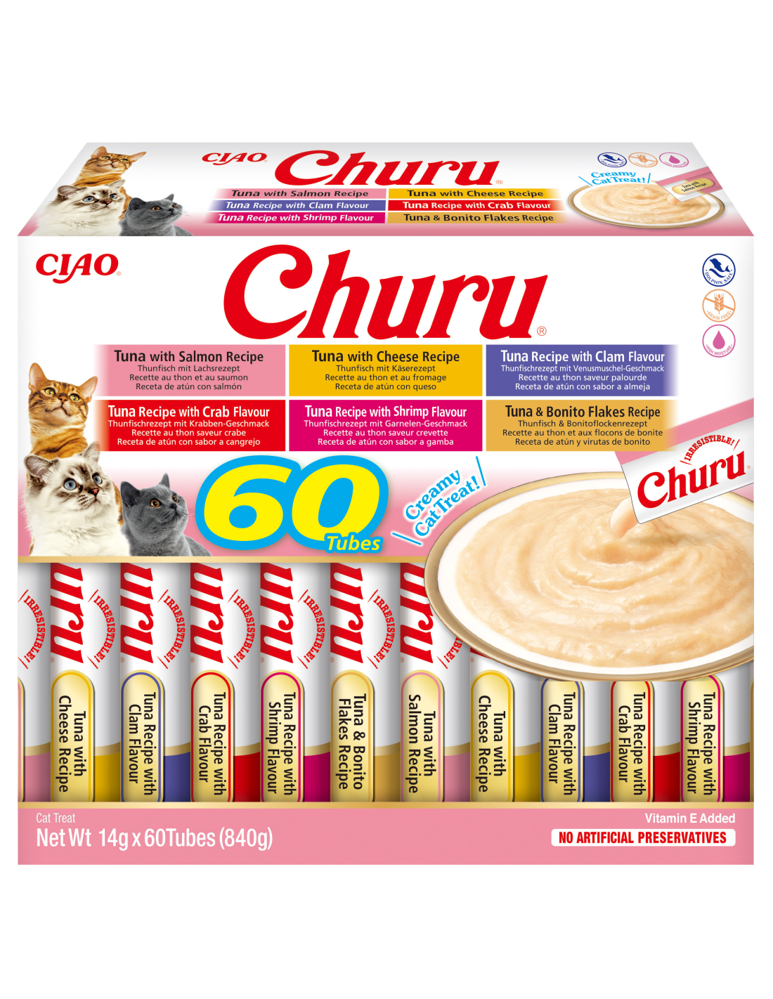 NABA CAT CHURU Variety Tuna 60x14g on spetsiaalselt valitud maiuste kogu teie kassile, millel on hõrk tuunikala maitse. Hoolikalt valitud koostisosad tagavad, et iga portsjon pakub teie kassile nii intensiivset maitset kui ka olulisi toitaineid.