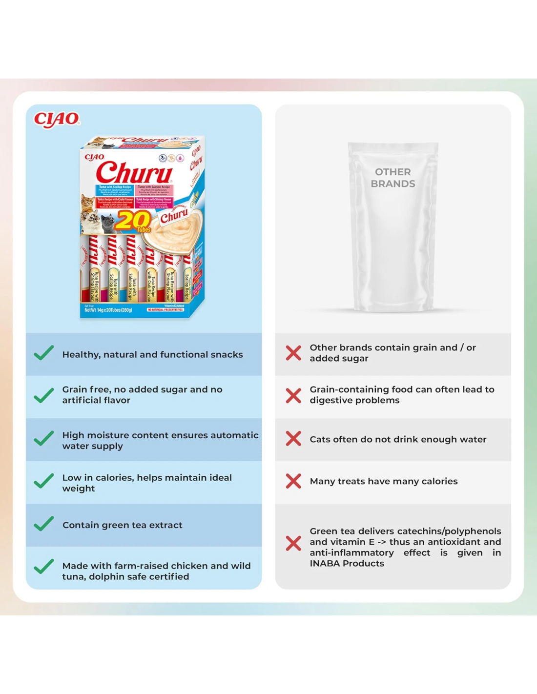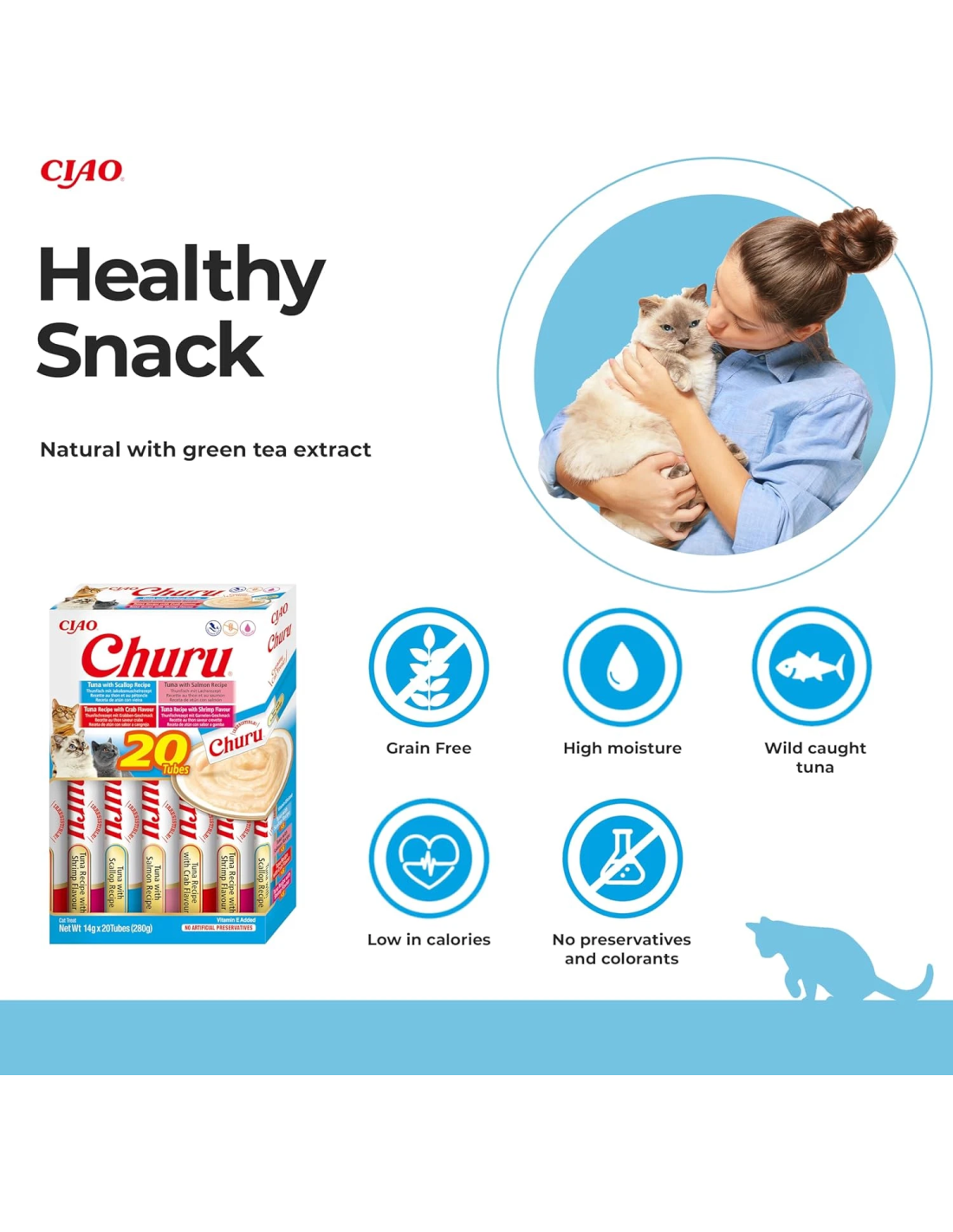 Uskumatult maitsvad ja tervislikud maiused, mis on valmistatud kõrgeima kvaliteediga, „inimtoidukvaliteediga“ koostisosadest. Churu maiused on madala kalorsusega, teraviljavabad ja säilitusainetevabad. Need on valmistatud vabapidamisel kasvatatud kanadest rangelt kontrollitud farmides ning jätkusuutlikult püütud, sertifitseeritud delfiiniohutu süvamere tuunikalaga.