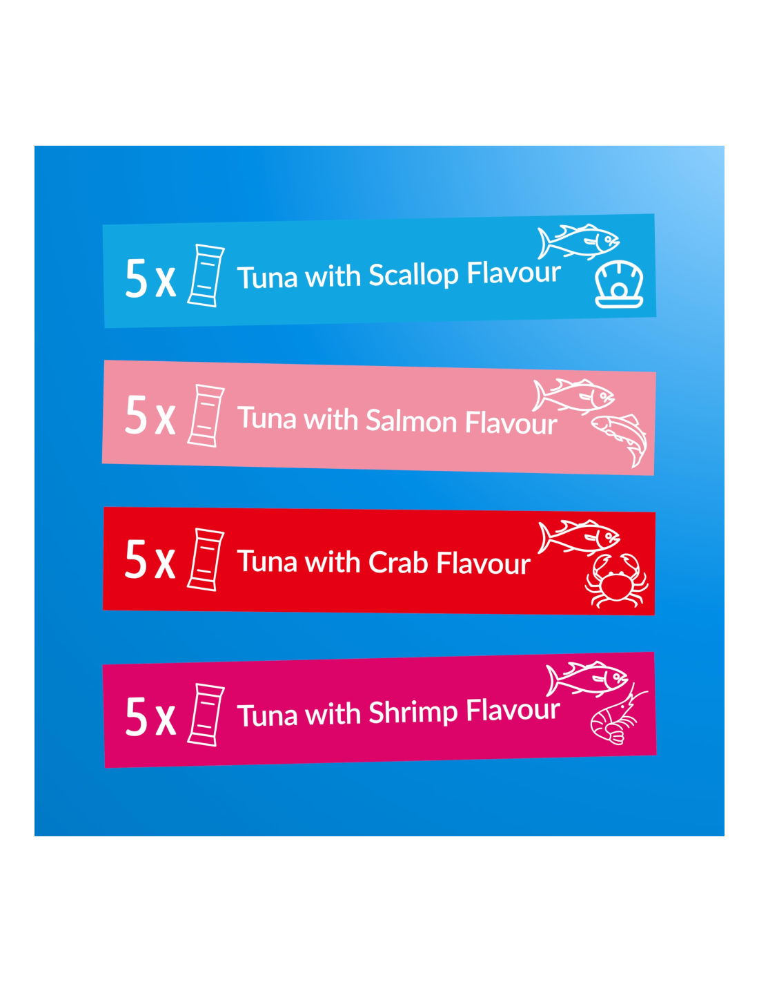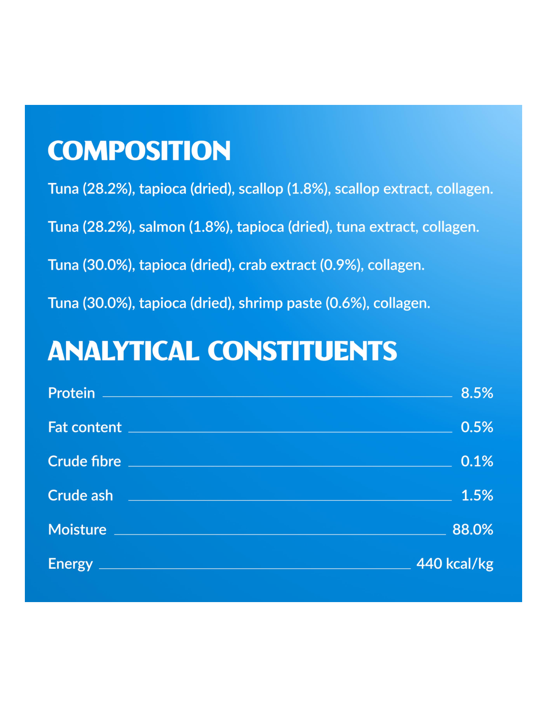 Tuunikala (30,0%), tapiokk (kuivatatud), krevetipasta (0,6%), kollageen.