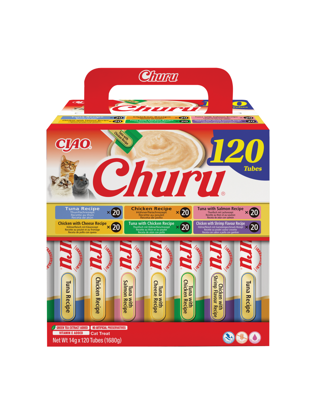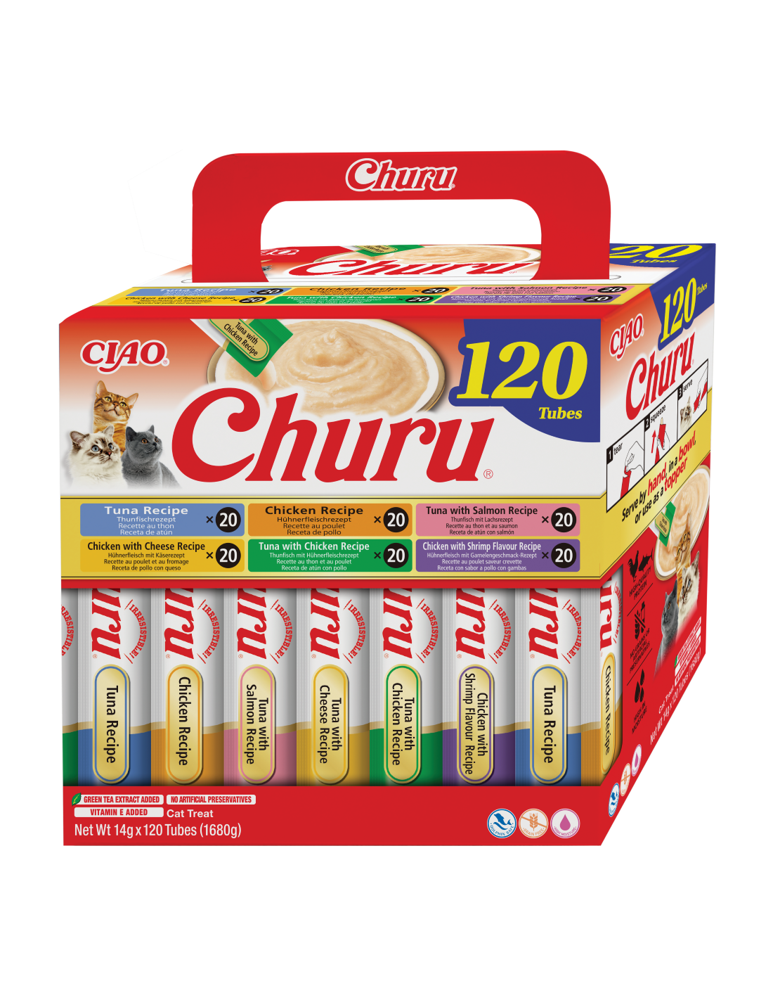 Churu on madala kalorsusega, teraviljavabad ja säilitusaineteta, valmistatud vabapidamisel kasvatatud kanadest, kes on kasvatatud rangelt kontrollitud taludes, ning jätkusuutlikult püütud, sertifitseeritud ja delfiinisõbralikust süvamere tuunikalast.