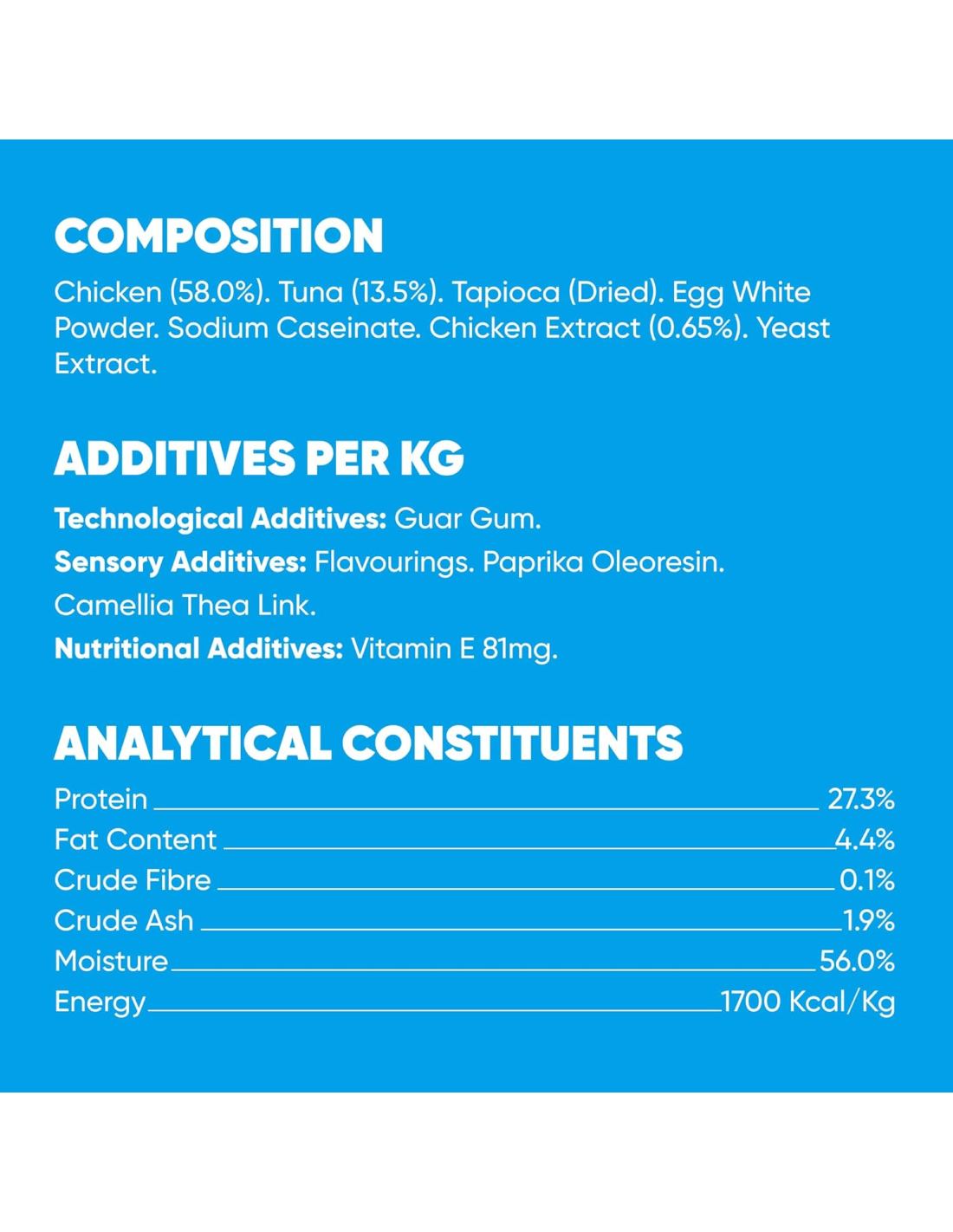 Koostis: Kana (58,0%), tuunikala (13,5%), tapiokk (kuivatatud), munavalgepulber, naatriumkaseinaat, kanaekstrakt (0,65%), pärmiekstrakt.