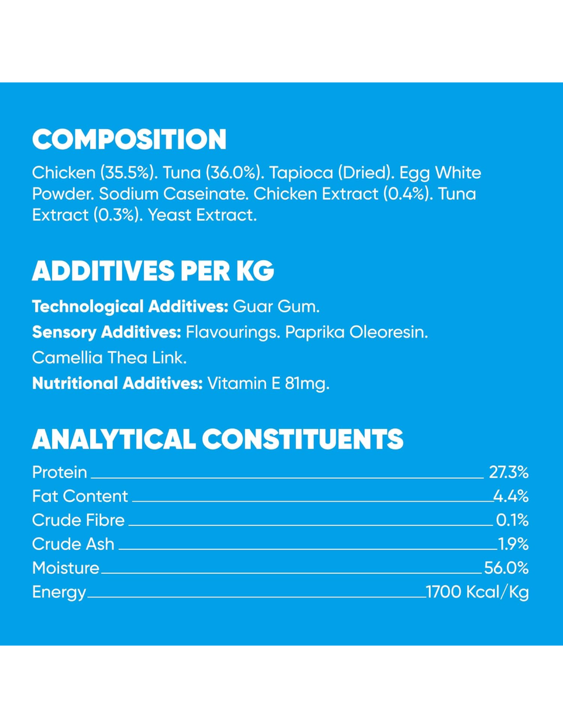 Koostis: Kana (35,5%), tuunikala (36%), tapiokk (kuivatatud), munavalgepulber, naatriumkaseinaat, kanaekstrakt (0,4%), tuunikalaekstrakt (0,3%), pärmiekstrakt.