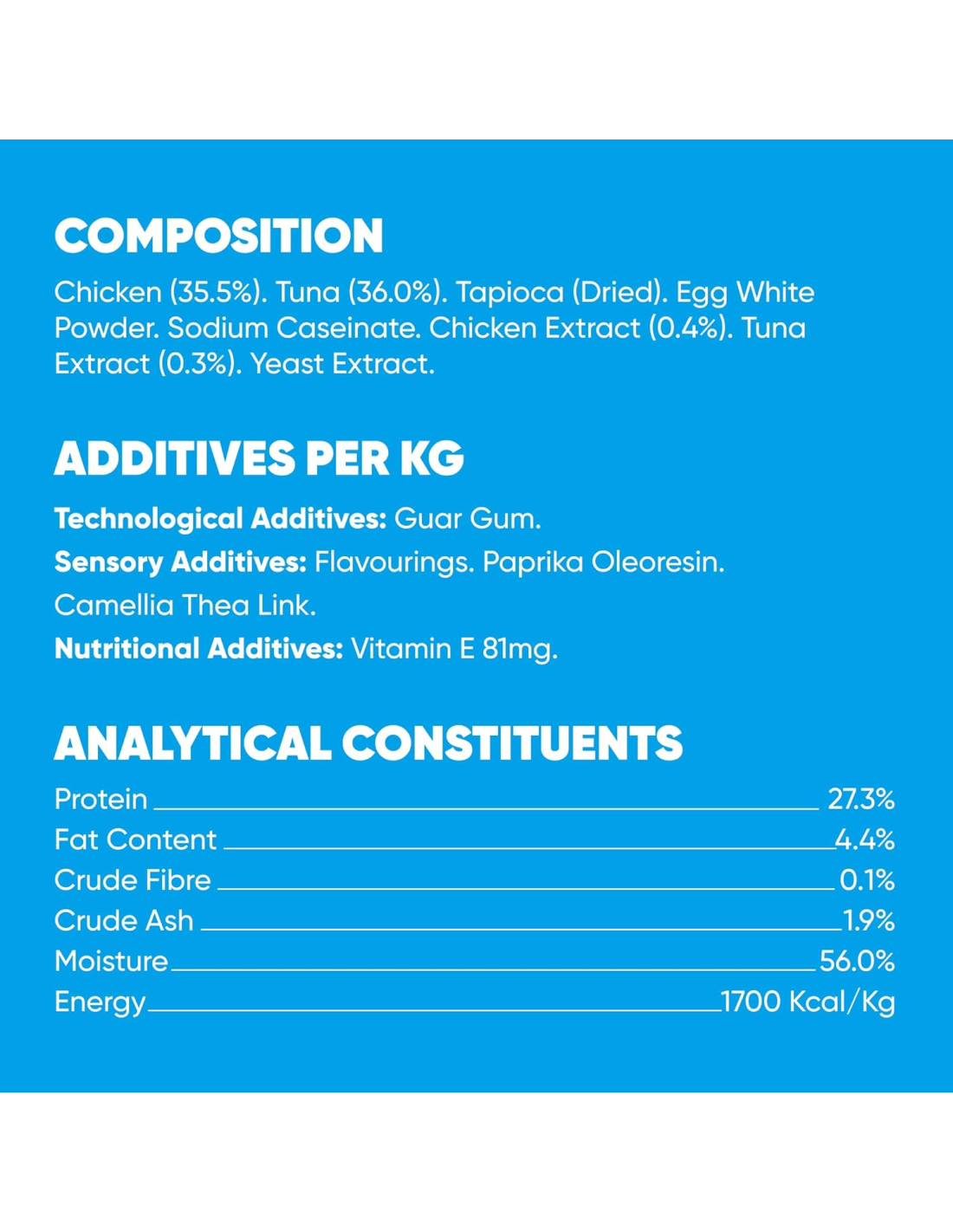 Koostis: Kana (35,5%), tuunikala (36%), tapiokk (kuivatatud), munavalgepulber, naatriumkaseinaat, kanaekstrakt (0,4%), tuunikalaekstrakt (0,3%), pärmiekstrakt.