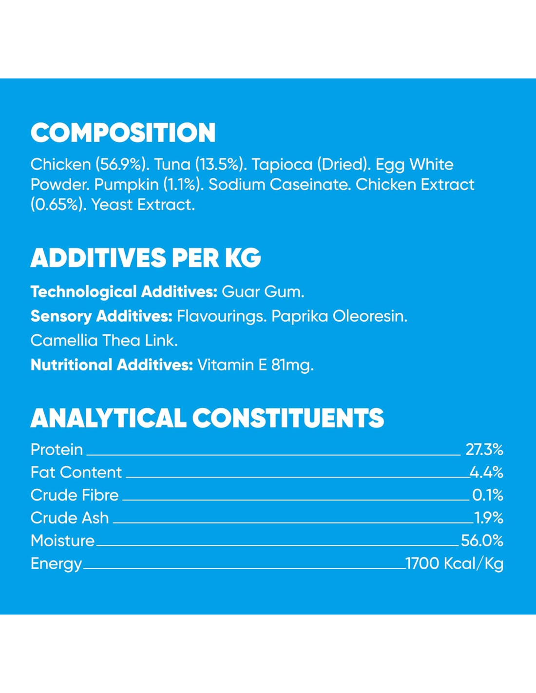 Koostis: Kana (56,9%), tuunikala (13,5%), tapiokk (kuivatatud), munavalgepulber, kõrvits (1,1%), naatriumkaseinaat, kanaekstrakt (0,65%), pärmiekstrakt.