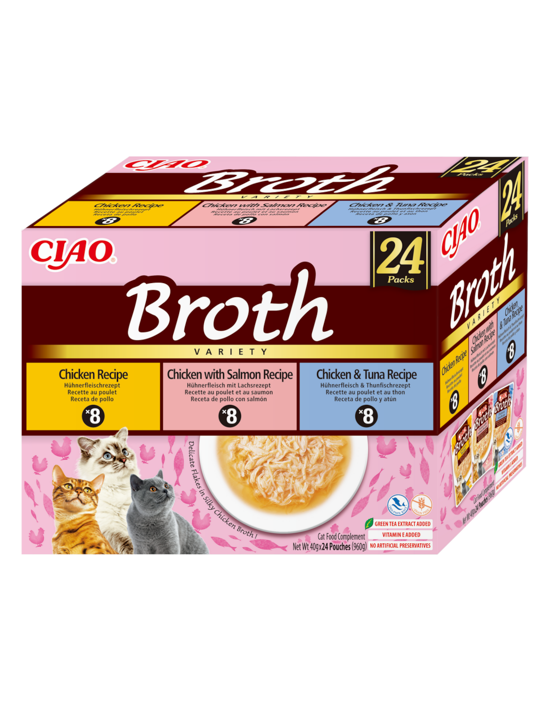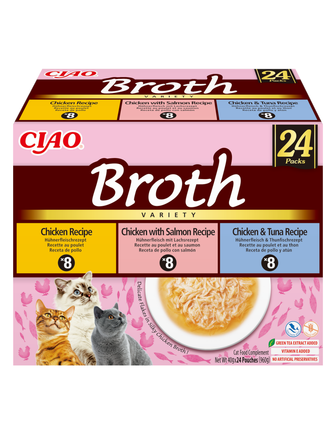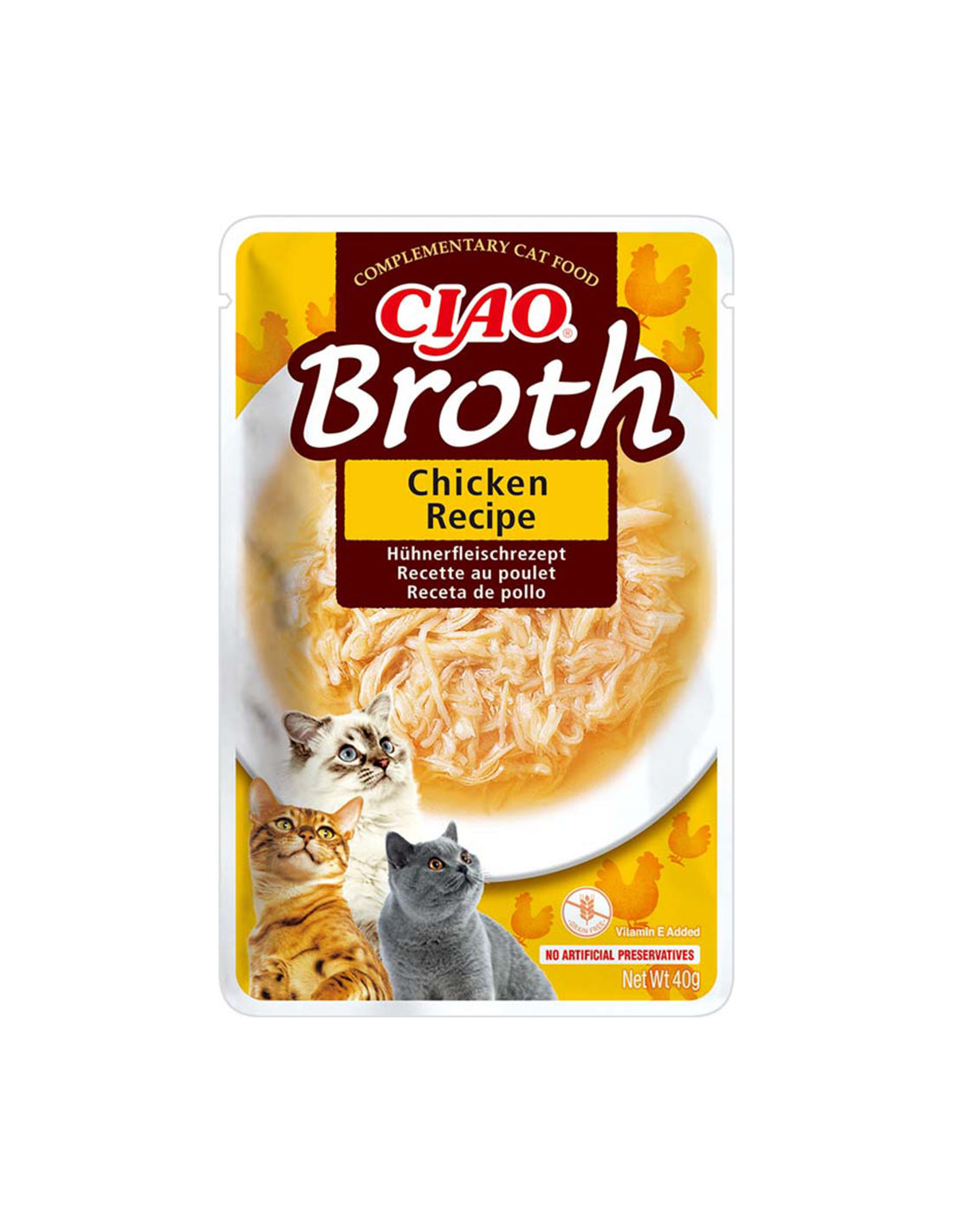 Inaba Broth on Jaapani märgtoit, valmistatud kõrge kvaliteediga koostisosadest. See toit, mis sisaldab kana- ja tuunikalakuubikuid puljongis, on teraviljavaba, säilitusainetevaba ja kunstlike värvainetevaba. Tauriin säilitab terve nägemise ja südame funktsiooni ning E-vitamiin toetab immuunsust. Toode on madala kalorsusega ja kõrge niiskusesisaldusega, tagades teie lemmiklooma piisava vedelikutarbimise.