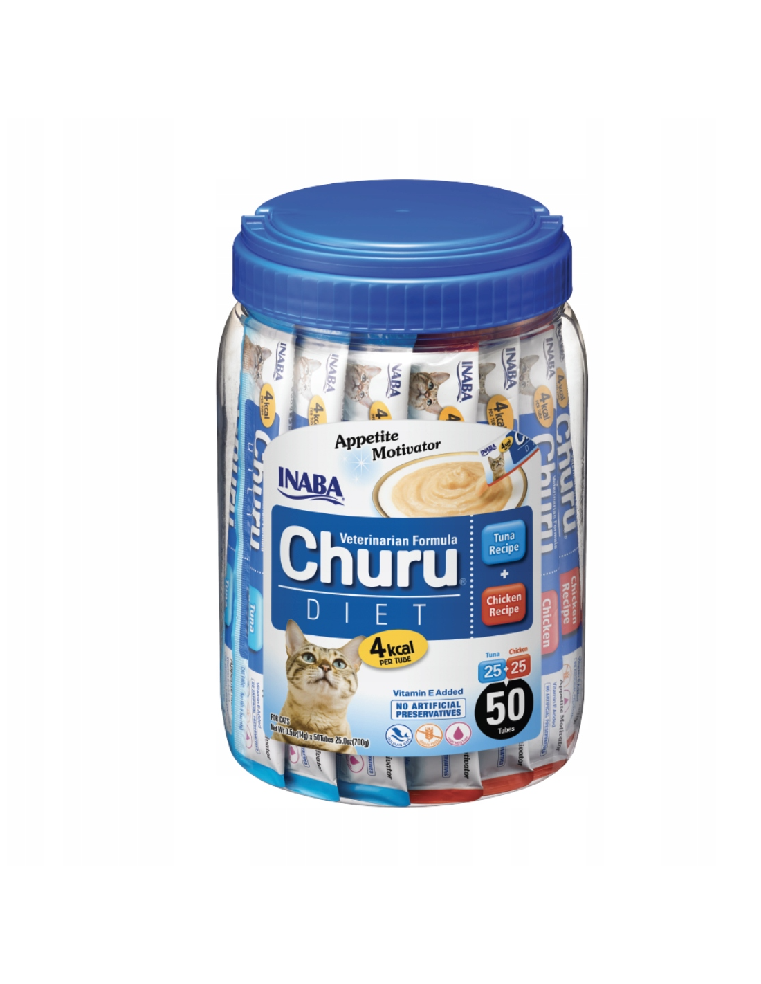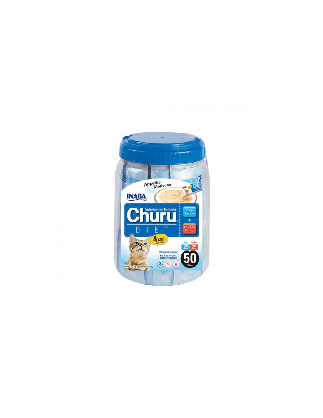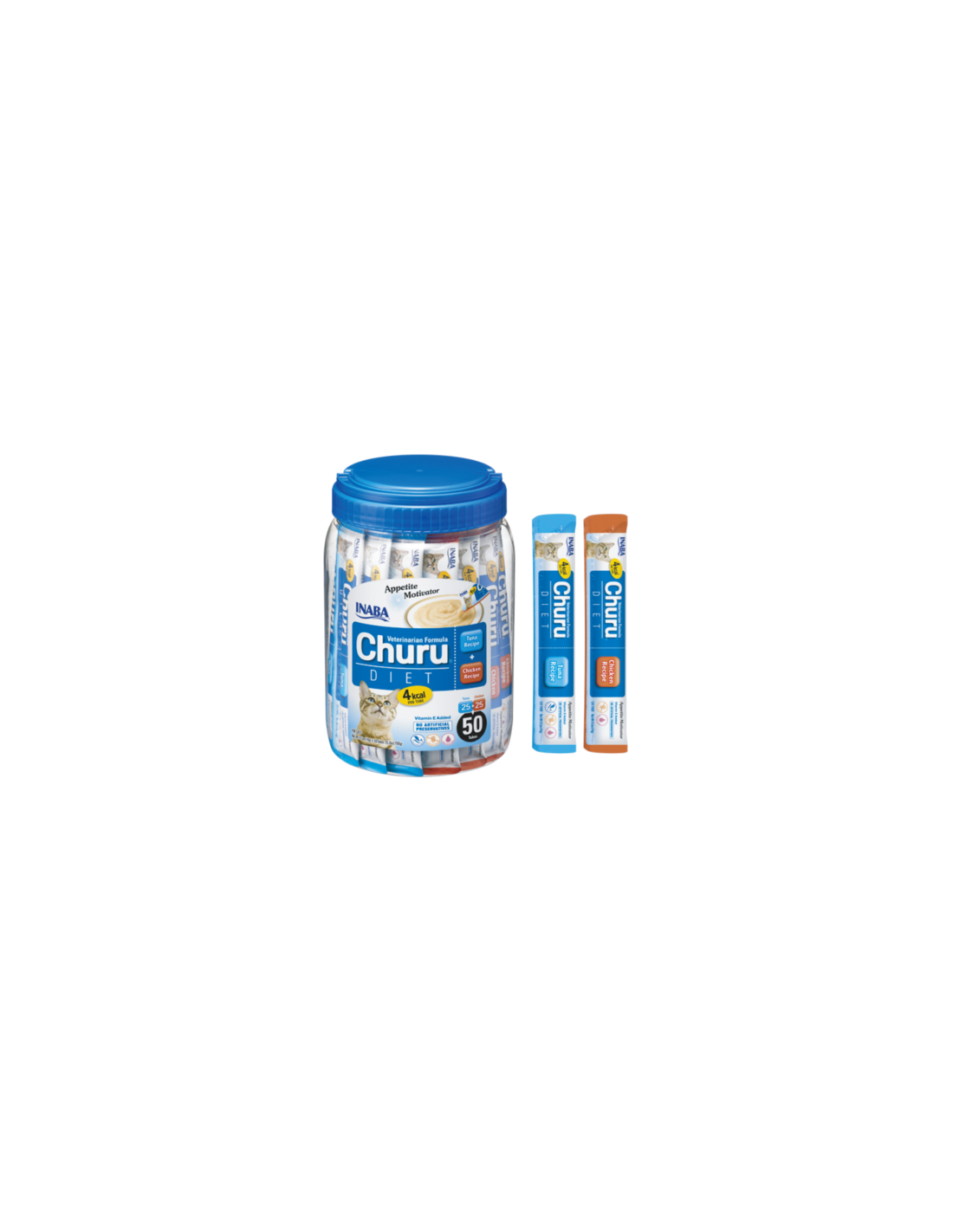 Churu Diet on saadaval 50 tk purgis, mis sisaldab 25 kana- ja 25 tuunikalamaitselist portsjonit.