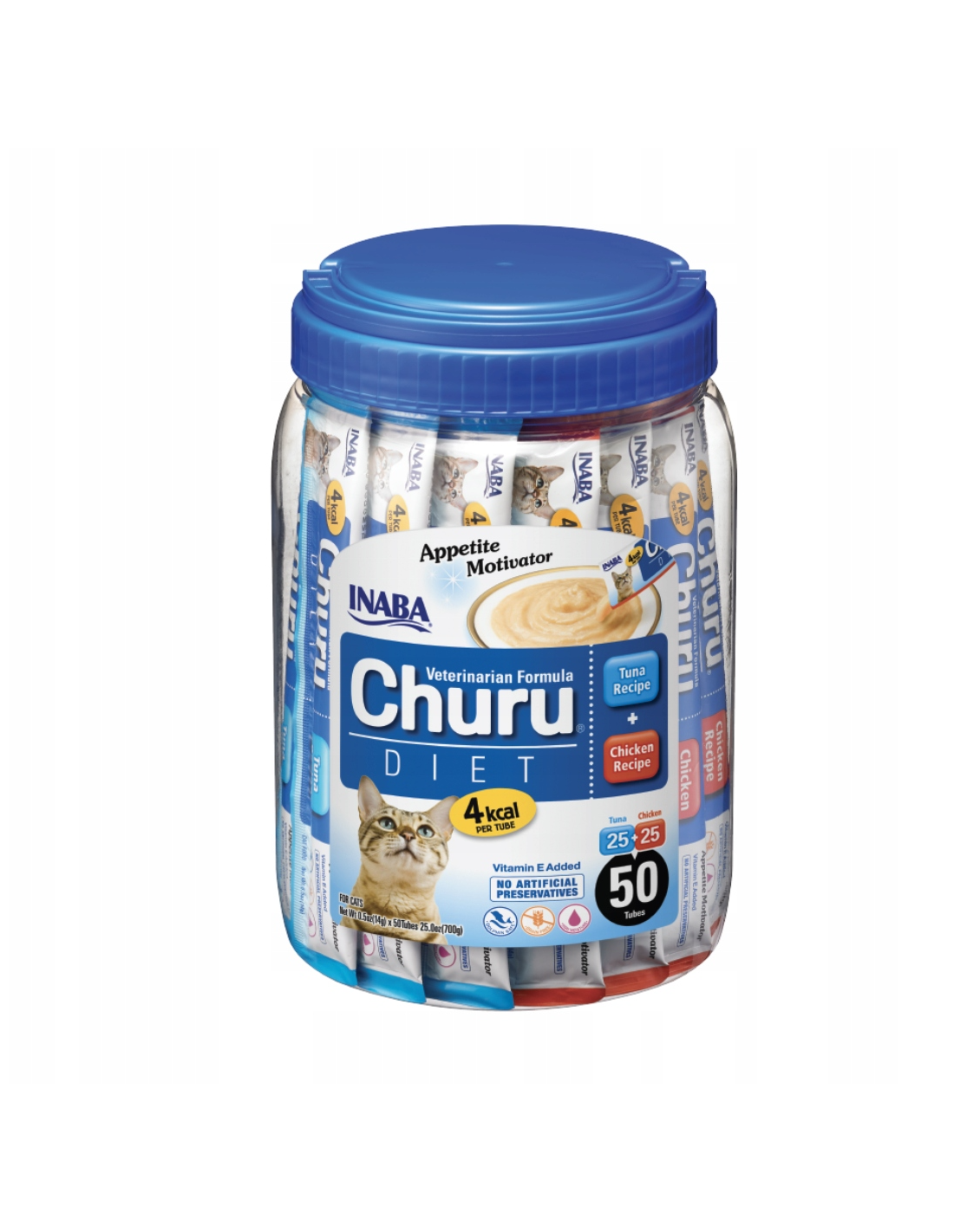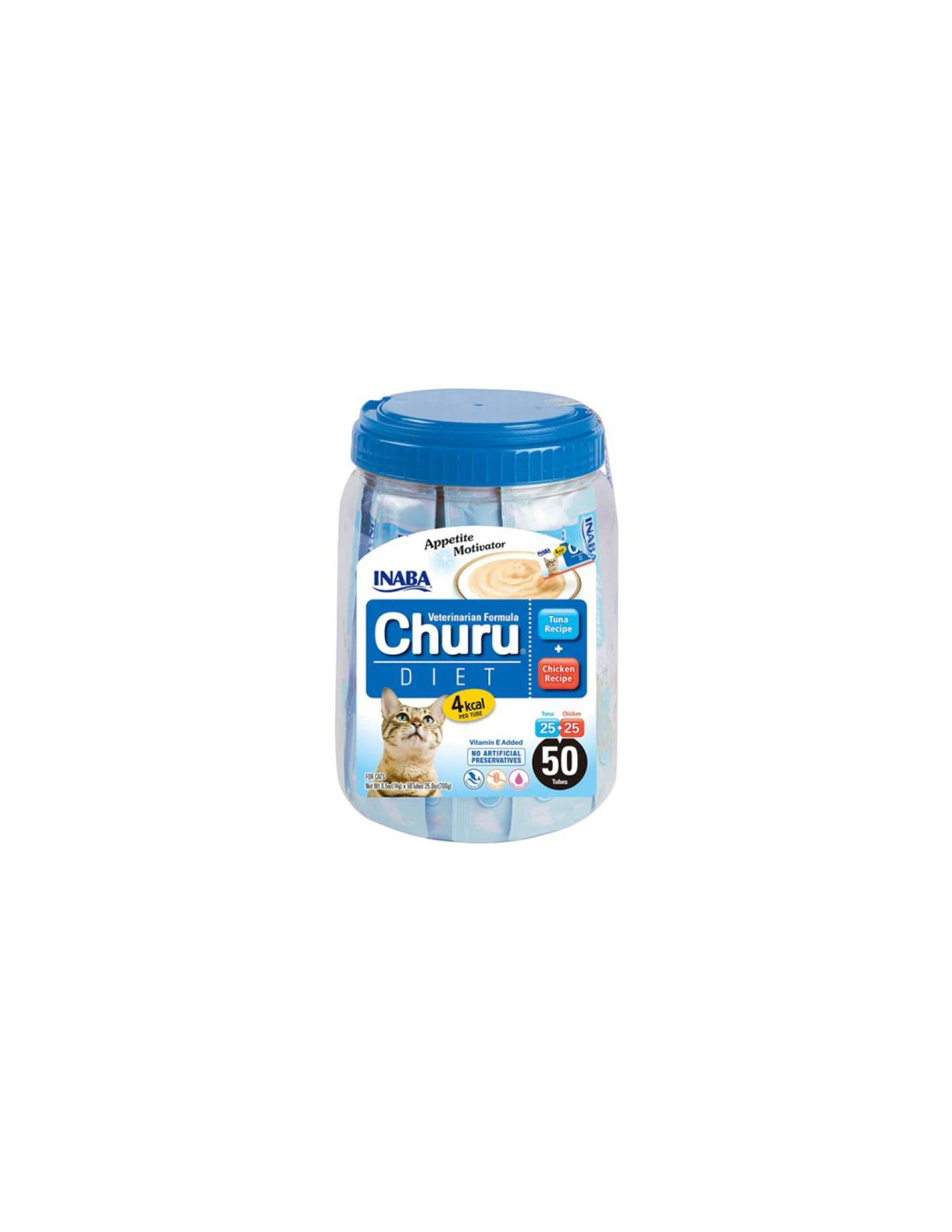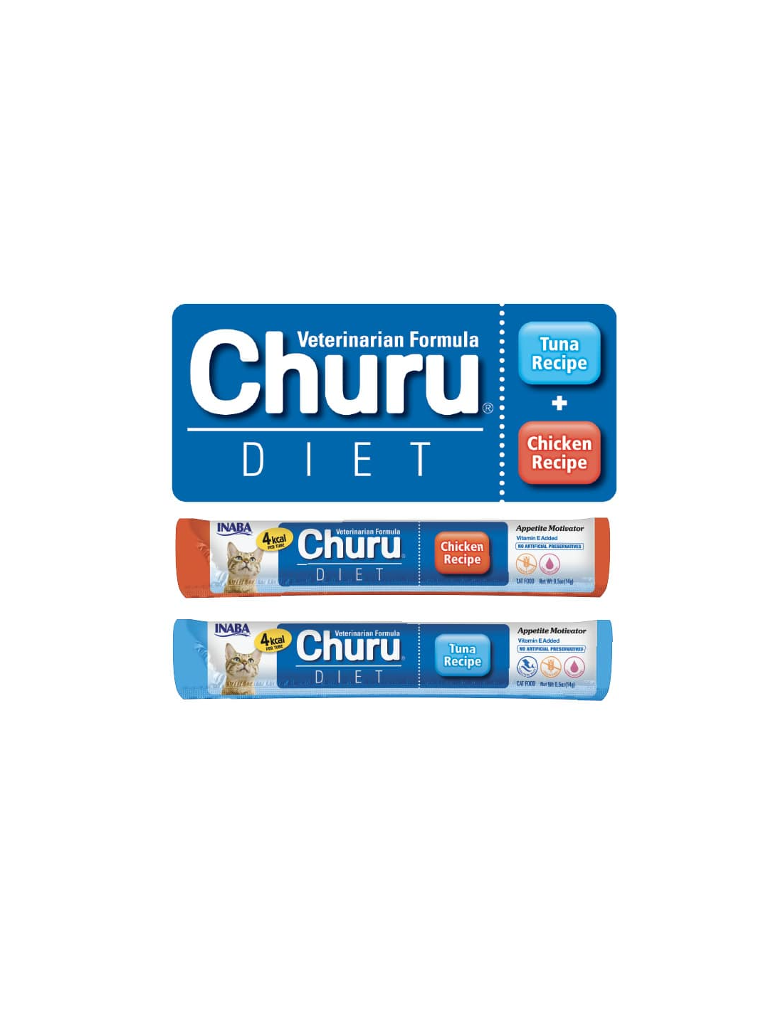 Churu Diet on saadaval 50 tk purgis, mis sisaldab 25 kana- ja 25 tuunikalamaitselist portsjonit.