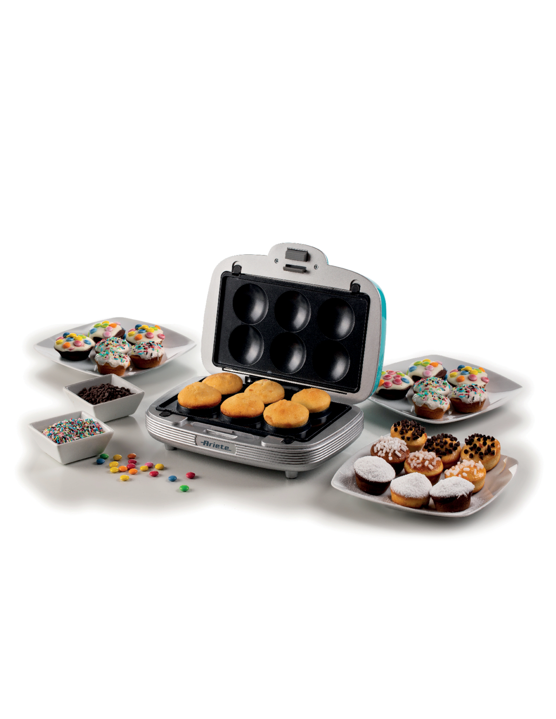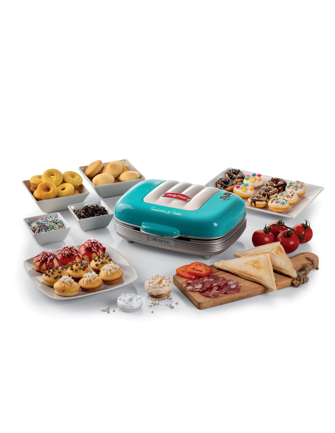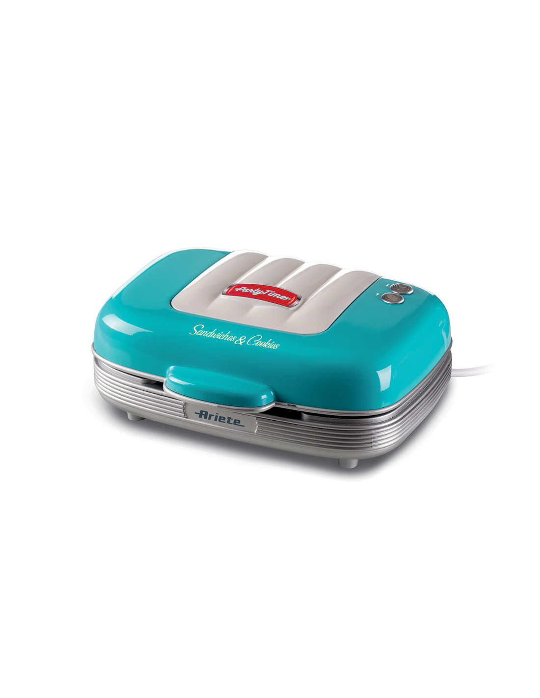 Multifunktsionaalne küpseti muffinide, sõõrikute ja võileibade valmistamiseks, unikaalse 50ndate Ameerika söögikoha disainiga. Ideaalne nii magusate kui ka soolaste suupistete lõbusaks valmistamiseks. Let’s party koos Party Time Arietega! Peo, vahepala või erilise päeva jaoks – saad valmistada rikkaliku laua head-paremat täis! Maitsvad muffinid, vastupandamatud sõõrikud ja täidetud võileivad. Üks lihtne ja kiire toode, millel on 3 mittenakkuvat, eemaldatavat ja vahetatavat plaati. Lõbutse köögis ja valmista palju maitsvat!