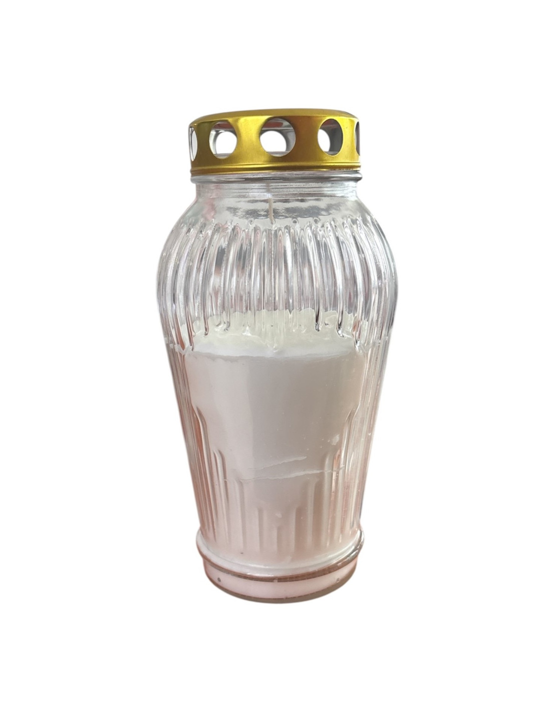 Valge kuldse kaanega erikujuline hauaküünal.