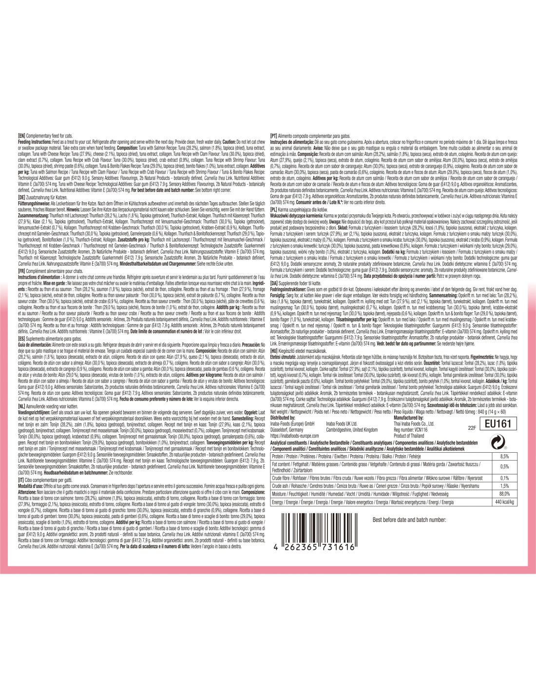 10 x tuunikalavalem rannakarpide maitsega: tuunikala (30,0%), tapiokk (kuivatatud), rannakarbiekstrakt (0,7%), kollageen.