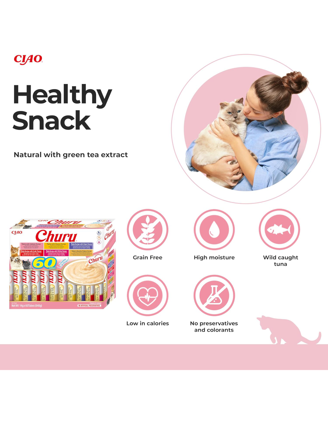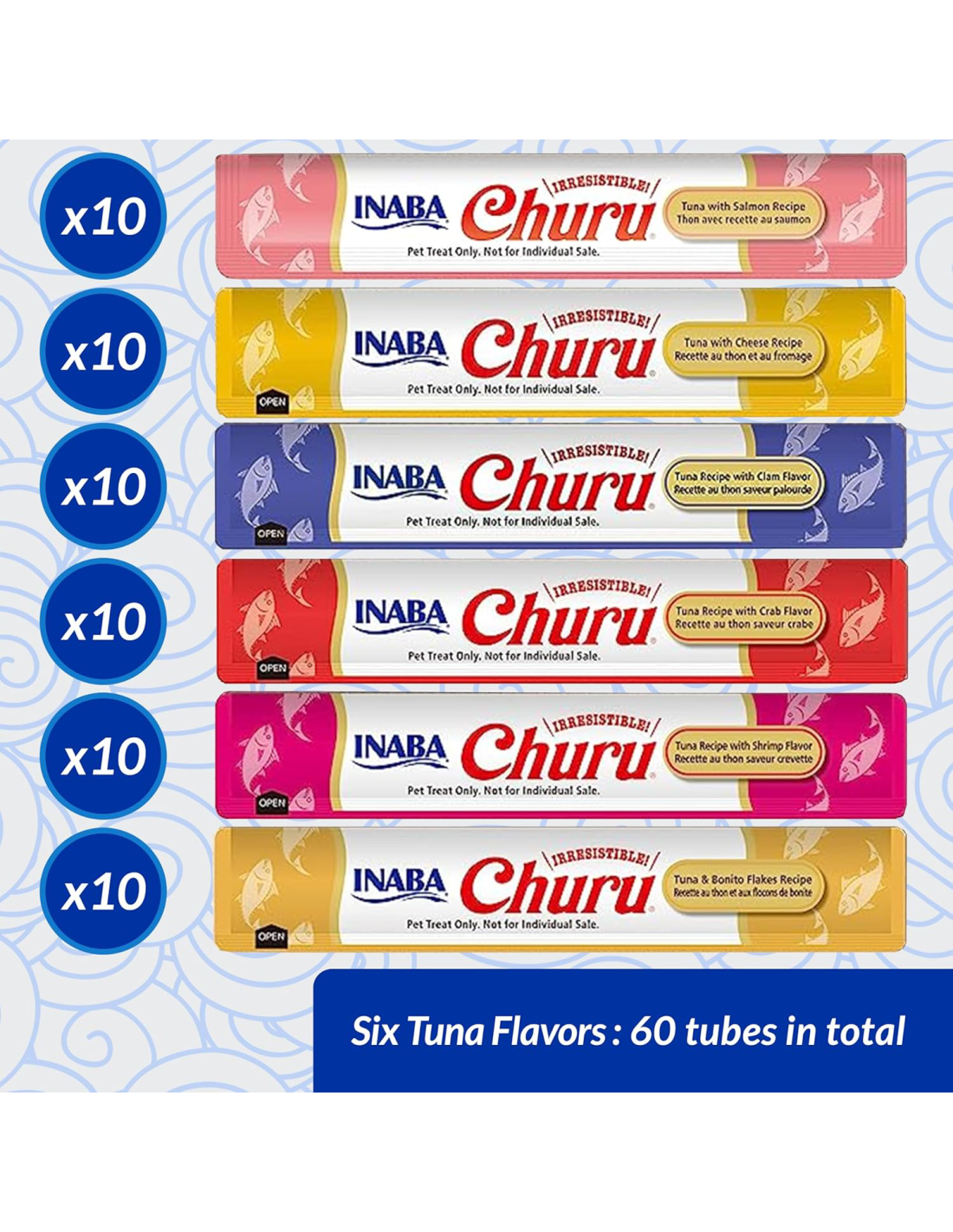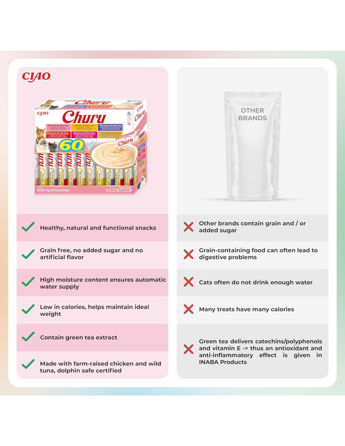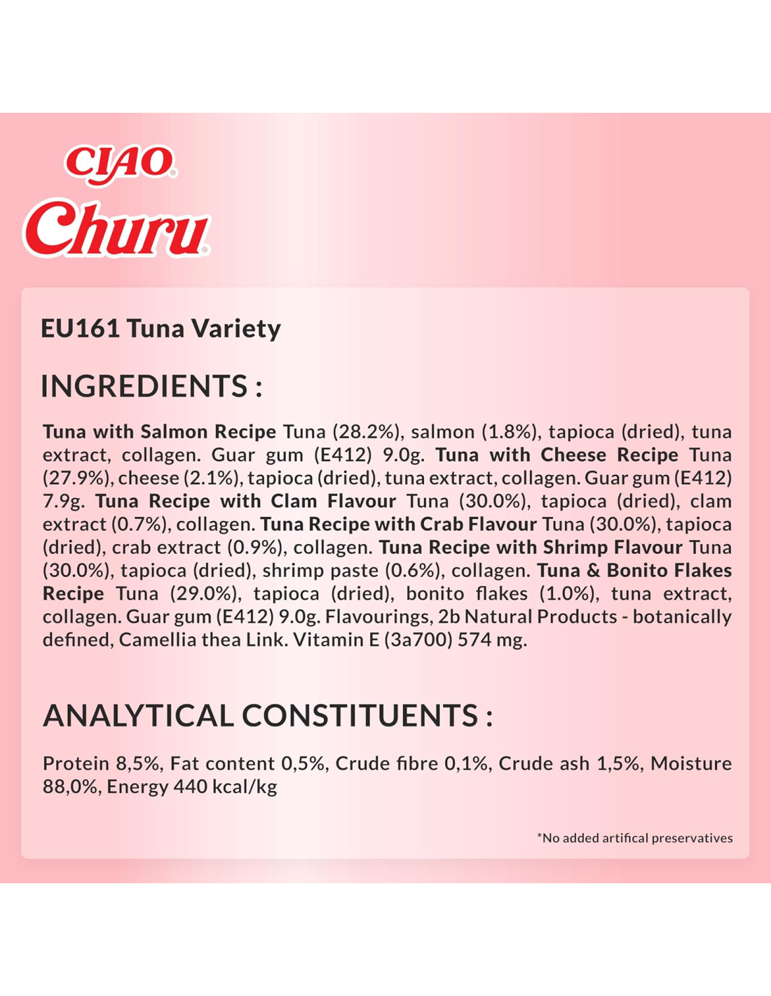 NABA CAT CHURU Variety Tuna 60x14g on spetsiaalselt valitud maiuste kogu teie kassile, millel on hõrk tuunikala maitse. Hoolikalt valitud koostisosad tagavad, et iga portsjon pakub teie kassile nii intensiivset maitset kui ka olulisi toitaineid.