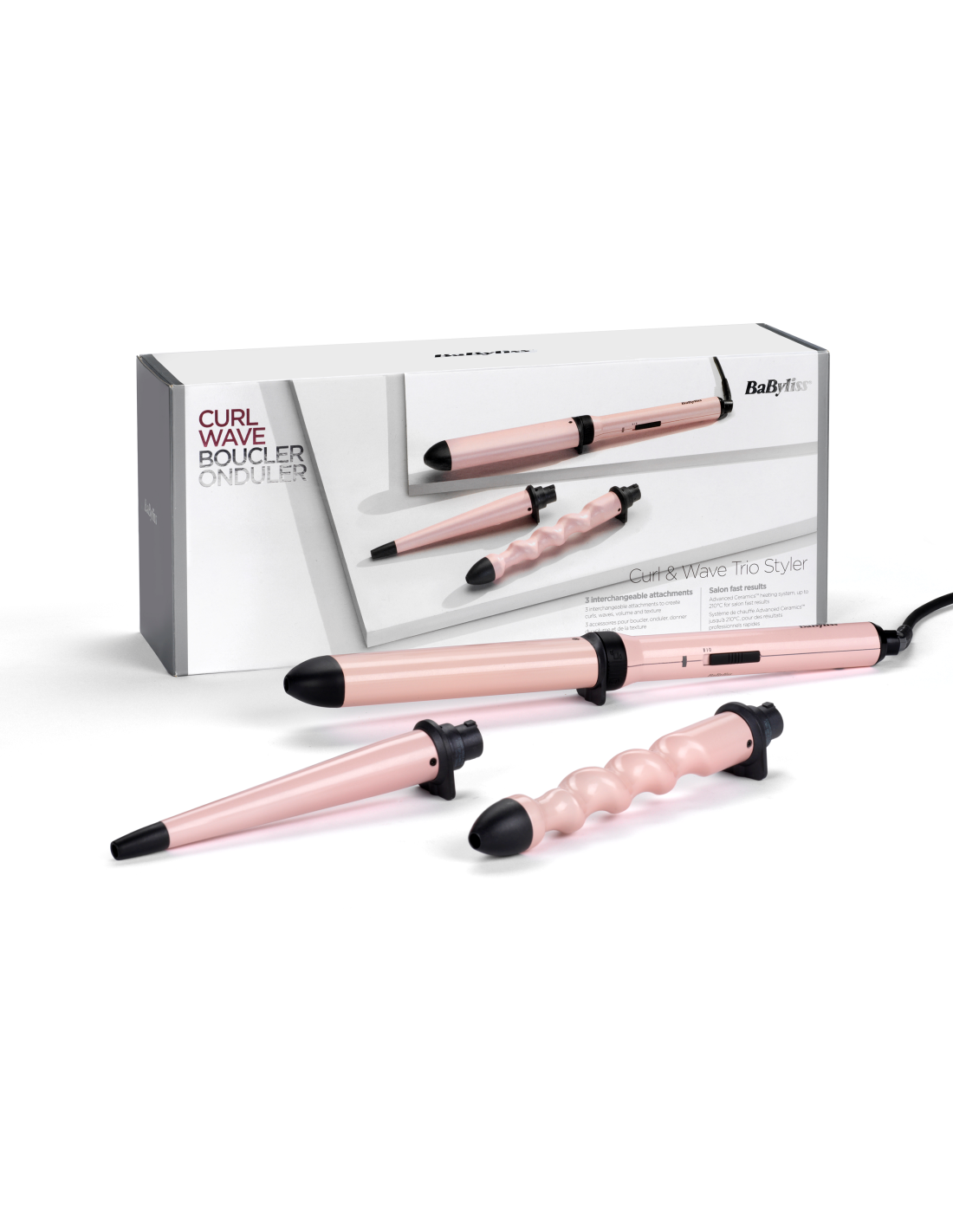 BaByliss Curl & Wave Trio on professionaalse jõudlusega soenguseade, millel on kolm vahetatavat toru lokkide, lainete ja säbrulise tekstuuriga soengu tegemiseks. Koonusekujulise toruga saab teha siledaid, tugevaid ja kauakestvaid lokke. Ovaalse toruga saab teha kohevaid ja lõtvu „merineitsi“ lokke. Keerdus toruga saan teha säbrulise tekstuuriga lokke. Ideaalne seade neile, kellele meeldib katsetada erinevaid soenguid.