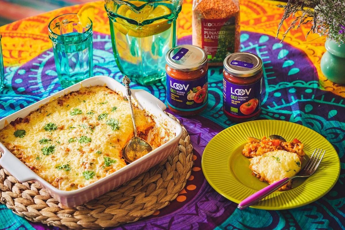 Prae natukene, lisa tükeldatud paprika ja suvikõrvits ning loputatud läätsed. Maitsesta soolaga ja lisa segule tomatipasta, Napoli kaste ja taimne koor.