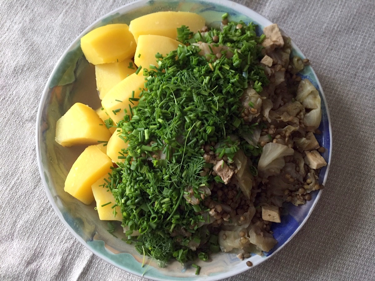 Viiluta kapsas ja lisa potti sibula-läätsesegu juurde. Hauta tasasel tulel, kuni läätsed ja kapsas on pehmed.