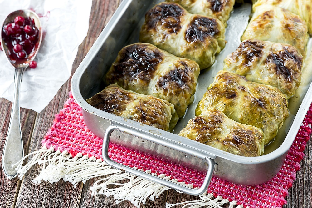 Maitsesta estragoni, soola ja musta pipraga, samuti vahtrasiirupiga. Jaga täidis kapsalehtedele ja keera need tihedateks rullideks.