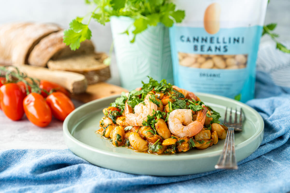 Haki sibul ja küüslauk väikesteks tükkideks. Prae kookosõliga kuumutatud pannil pruuniks. Lisa kurkum ja siis hakitud tomatid. Prae natukene aega ja siis lisa hakitud koriander, Cannellini oad ning maitsesta soola ja pipraga. Teise panni peal prae krevetid ja maitsesta soja kastmega. Tõsta oaroog taldrikule ja lisa krevetid.