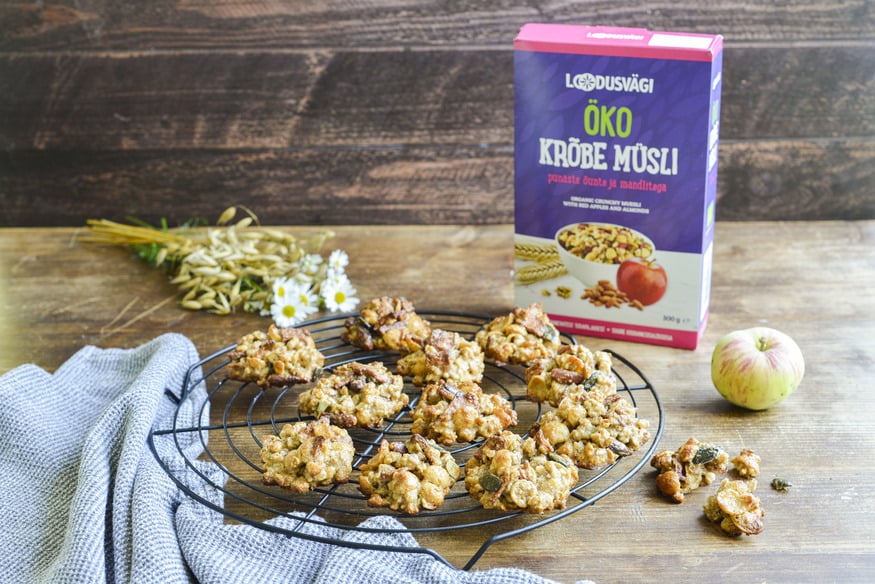Kui müsli on ennekõike hommikusöök, siis need küpsised on ideaalsed õhtuse tee juurde või magustoiduks. Müsliküpsised on ka suurepärane energiarikas vahepala. Retseptis on kasutatud punaste õunte ja mandlitega müslit, aga sama hästi sobivad ka muud Loodusvägi krõbedad müslid.