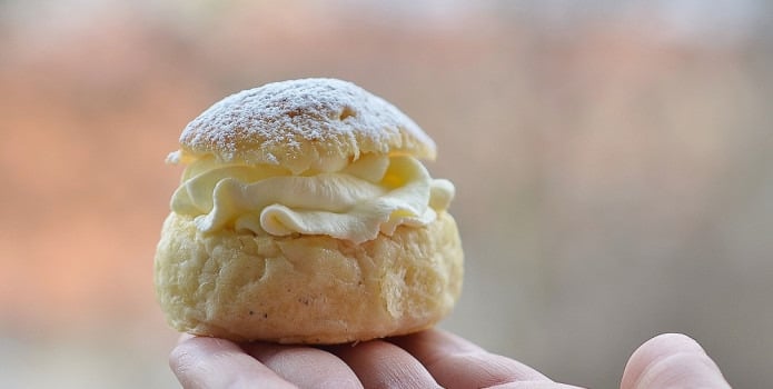 Aseta tainas jahuga ülepuistatud lauale, rulli piklikuks vorstiks ning lõika ühesuurusteks juppideks. Vooli ja rulli juppidest ühtlased pallid, veereta neid laual jahus ja silita käte vahel ringjate liigutustega, et eemaldada pallidelt voldid ja ebaühtlused. Aseta tainapallid õlitatud küpsetuspaberiga kaetud ahjuplaadile ja lase kerkida uuesti kahekordseks (u tund aega). Kuklid võib kena läike saamiseks enne ahjupanekut lahtiklopitud munaga üle pintseldada. Küpseta eelsoojendatud ahju alumises osas suurte kuklite puhul 225 kraadi juures umbes 8-10 minutit ja väikeste kuklite puhul 250 kraadi juures 5-7 minutit. Lase jahtuda. Lõika ära kuklite kaaned. Uurista lusikaga kuklitelt sisu välja ja pudista kaussi. Riivi martsipan jämedalt ja sega see saiapudi ning kookosjoogiga ühtlaseks massiks. Täida kuklid seguga. Vahusta kookoskoor (hoia seda eelnevalt vähemalt paar tundi külmas ja eralda koorene osa kookosveest lusikaga) ja pritsi see kreemipritsiga või aseta lusikaga kuklitele. Kõige peale aseta kaunistuseks kaas ja sõelu kuklid tuhksuhkruga üle. Serveeri suurepärase musta kohviga.