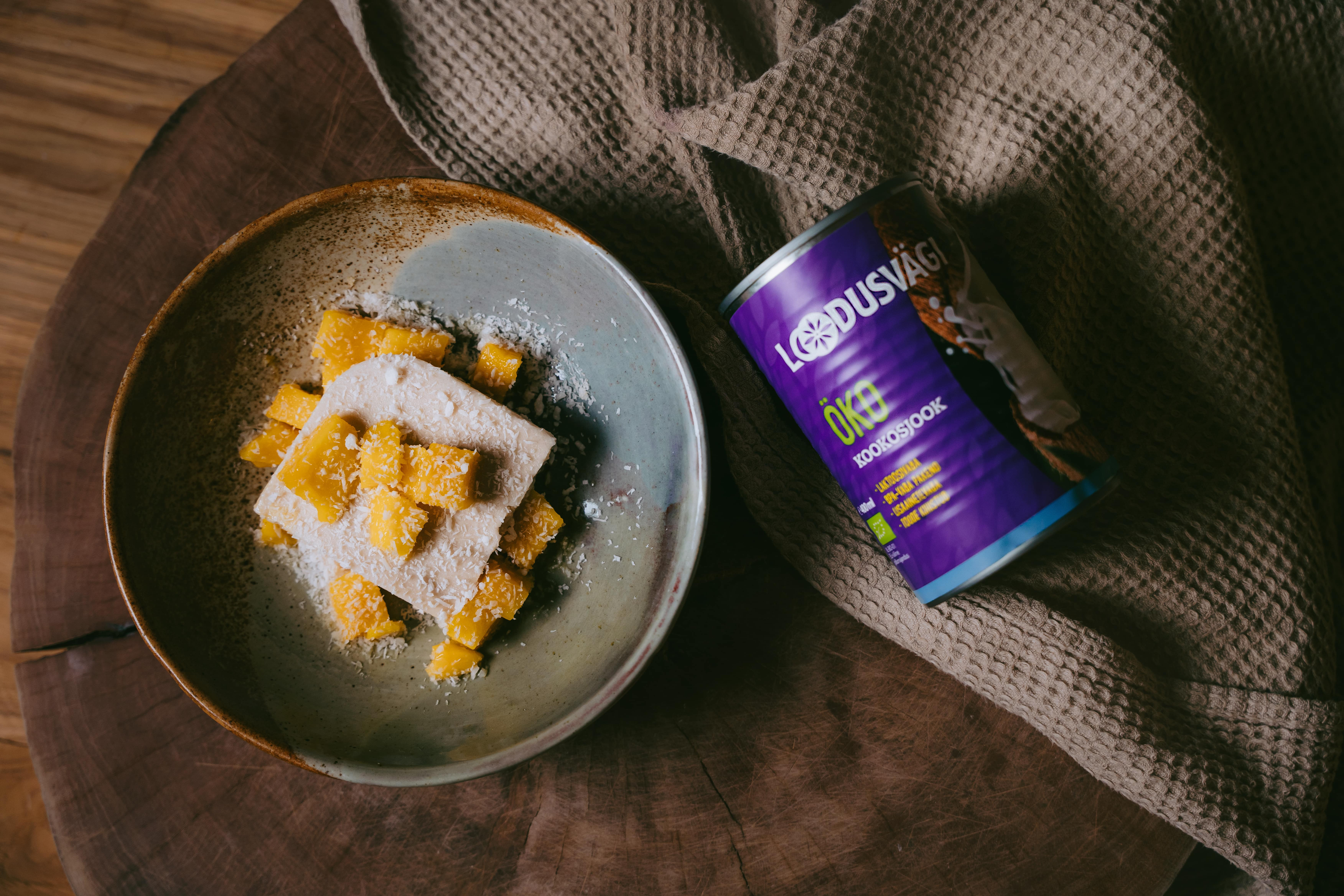 Lõika puding ruutudeks ja serveeri mangokuubikute ning kookospuruga.