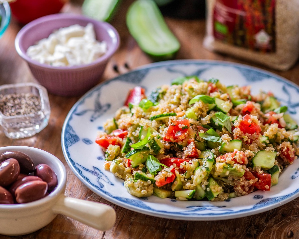 Siin kirevas salatis saavad kokku värske kurk, magus küps tomat, kreemine avokaado, kergelt krõmpsuv kinoa, ürdid, oliiviõli, pisut palsamiveiniäädikat ja maitseained. Igaüks võib seda salatit oma maitse järgi edasi arendada.