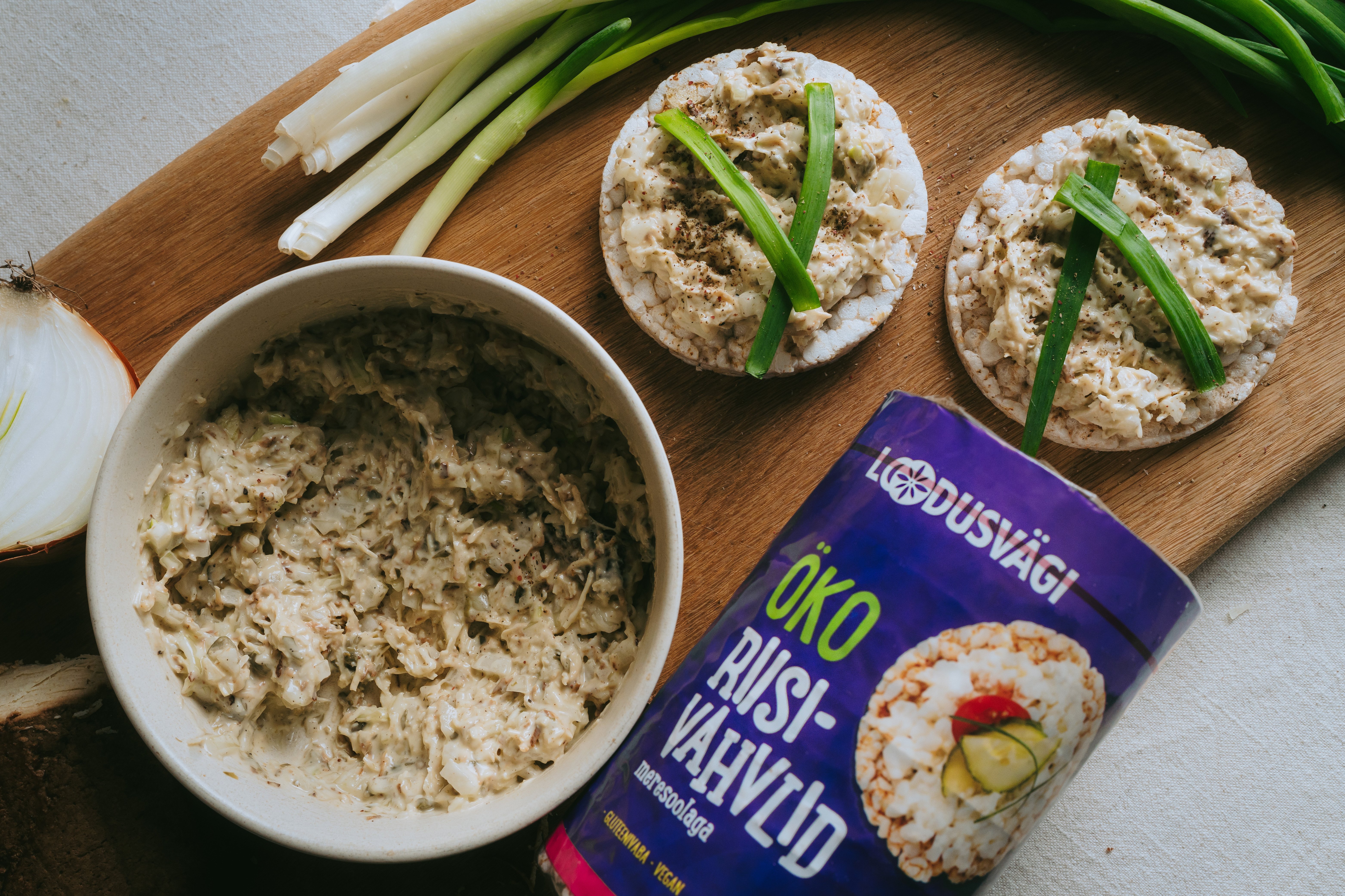 Haara pakk Loodusväe riisivahvleid, kata need määrde, värske rohelise sibulaga ja siis naudi!