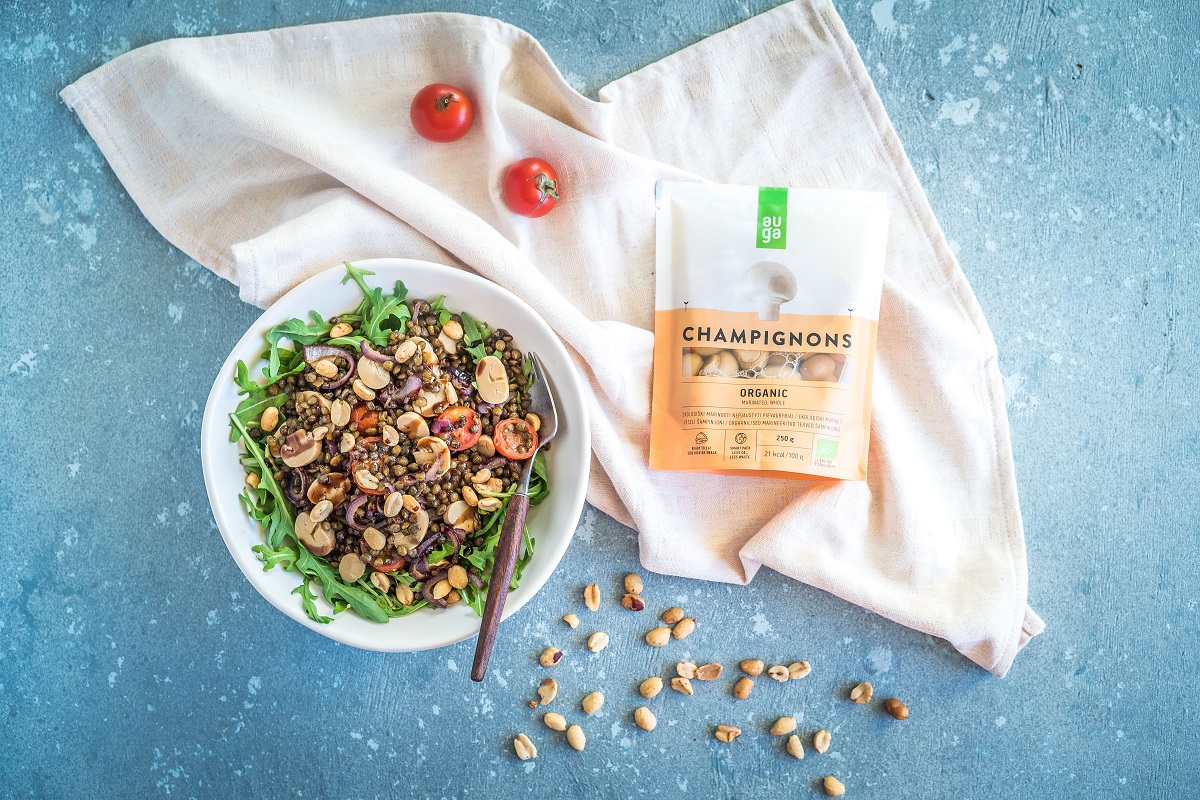 Loputa läätsed külma jooksva veel all ning pane läätsed keema (pakil on kirjas, kui kaua neid täpselt keetma peab, et tulemus mõnus ja krõmps jääks). Samal ajal haki sibul õhukesteks viiludeks ja prae veidi pannil koos kookosõliga. Kui läätsed on valmis, kurna nad ära ja vala pannile. Poolita kirsstomatid ja viska need pannile läätse-sibula segule seltsi. Lisa natuke Himaalaja soola, jahvatatud vürtsköömneid ning jahvatatud musta pipart. Prae paar minutit. Võta kausike, kata selle põhi rukolaga, tõsta rukola peale praetud läätsesegu, lisa marineeritud šampinjonid ja puista kõige peale krõmpsuvaid maapähkleid. Pritsi salatile natuke oliiviõli ja balsamicot ja lase heal maitsta!