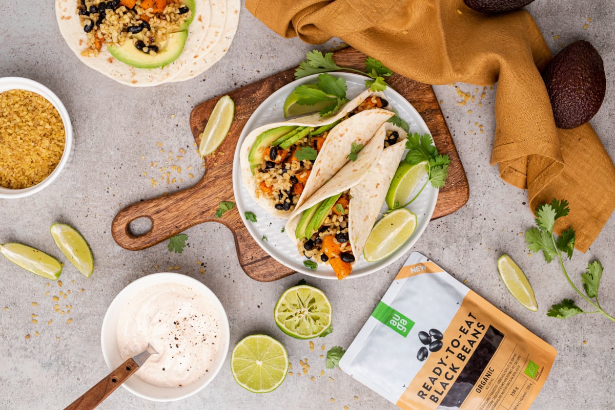 Takod bulguri, mustade ubade ja röstitud kõrvitsaga seob kokku kreeka jogurtist valminud kaste. Mis takode puhul parim, neis saab kombineerida just need maitsed, mis sulle meeldivad ja välja jätta koostisosad, mis nii meeltmööda ei ole. Kõrge kiudainesisaldusega proteiinirikkad kohe kasutamiseks valmis mustad oad sobivad nii toidu kõrvale kui ka erinevate roogade valmistamiseks. 4 portsjonit takosid valmivad 45 minutiga.