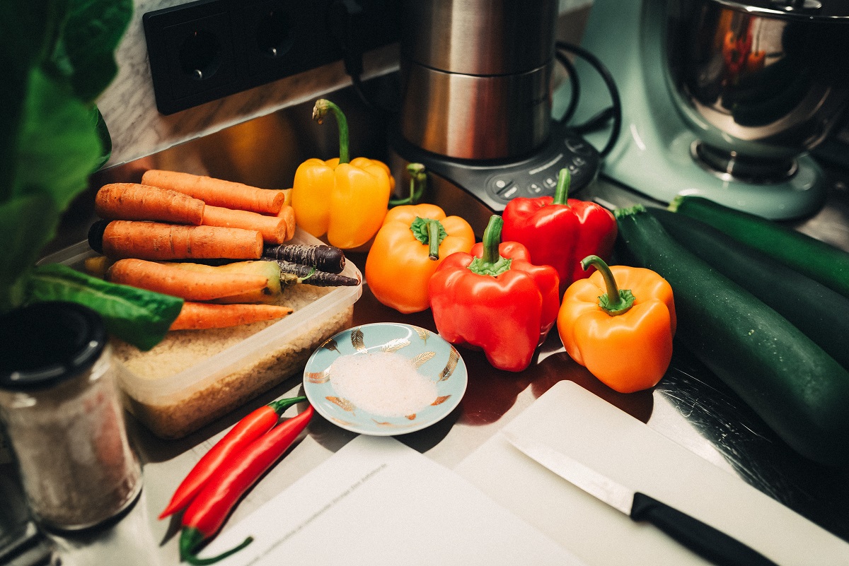 Puhasta ja haki väikesteks tükkideks porgand ja paprika. Ribasta suvikõrvits (kui spetsiaalset agregaati ei ole, lõika lihtsalt noaga väga peeneks)