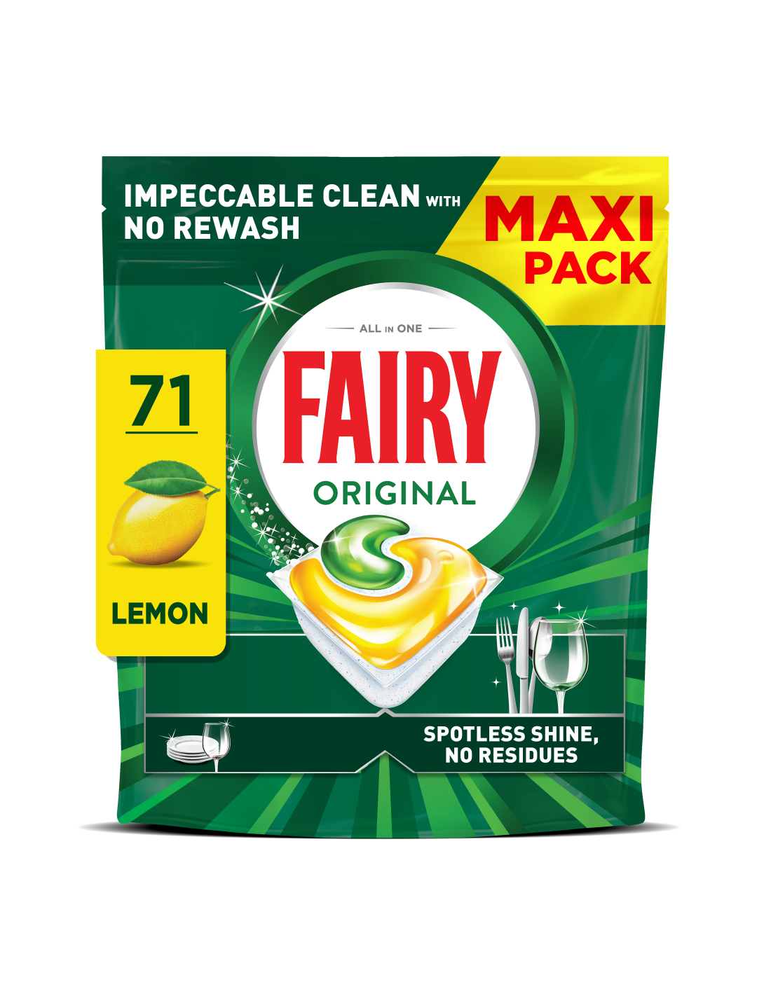 Fairy Original All in One’i nõudepesumasina tabletid pesevad nõud esimese korraga ning on tõhusad isegi kuivanud rasva korral, muutes sinu nõud säravalt puhtaks. Fairy ühendab vedeliku ja pulbri üheks võimsaks kapsliks. Selle ülilahustuv kott lahustub kiirelt nii, et see hakkab töö lõpuleviimiseks kiirelt puhastama. Ja neid on nii lihtne kasutada. Lahtipakkimine pole vajalik, pane need lihtsalt nõudepesumasina pesuaine dosaatorisse.