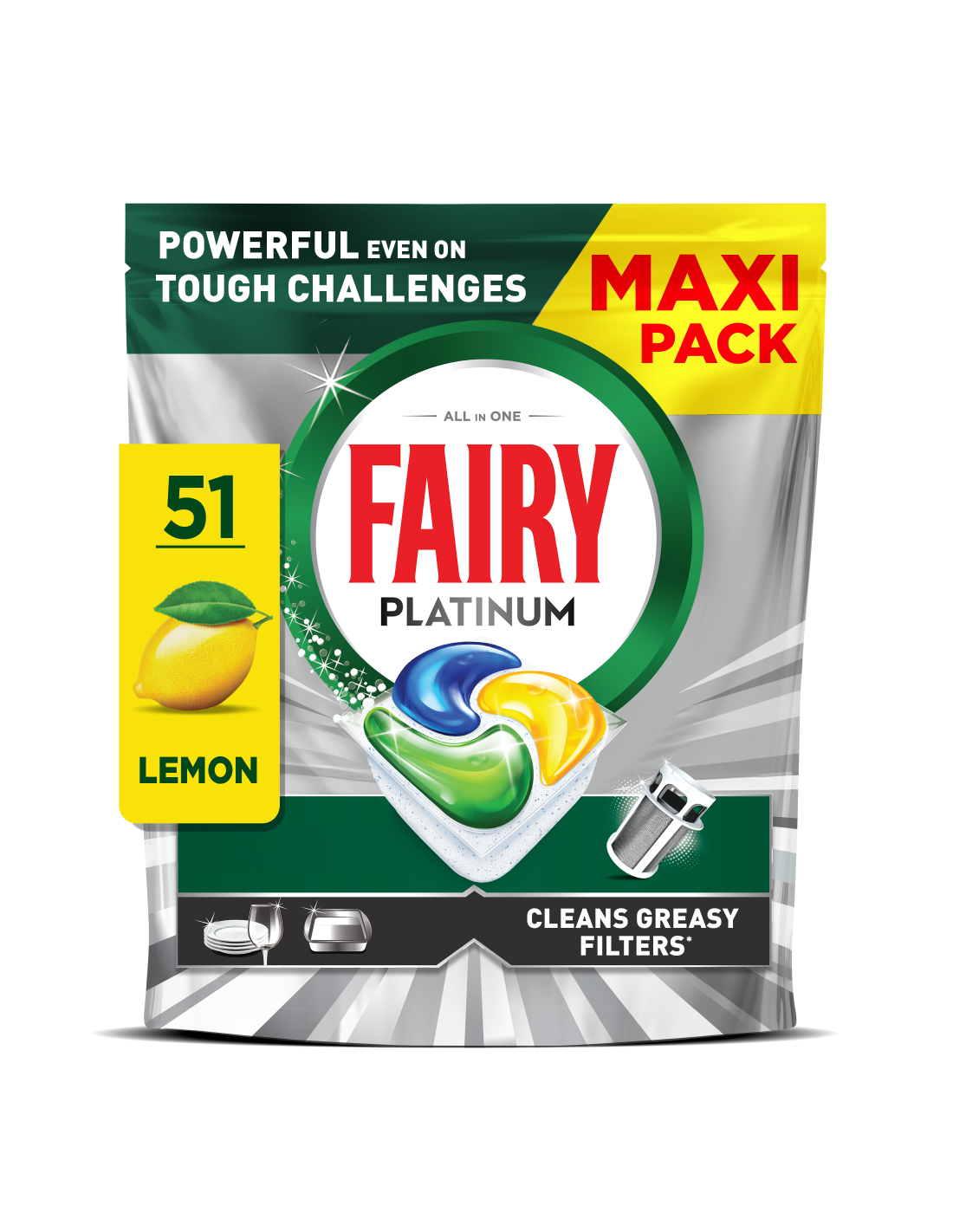 Fairy Platinum All in One’i nõudepesumasina tabletid pesevad nõud esimese korraga ning tulevad toime ka kõige raskemate ülesannetega, muutes sinu nõud säravalt puhtaks. Fairy Platinumil on puhastusjõud, mis annab sulle enesekindluse valmistada mistahes toitu, teades, et see puhastab rasvast isegi masina rasvase filtri ning jätab nõud ja nõudepesumasina säravalt puhtaks. Fairy ühendab vedeliku ja pulbri üheks võimsaks kapsliks. Selle ülilahustuv kott lahustub kiiresti nii, et see hakkab töö lõpetamiseks kiirelt puhastama. Ja neid on nii lihtne kasutada. Lahtipakkimine pole vajalik, pane need lihtsalt nõudepesumasina pesuaine dosaatorisse.