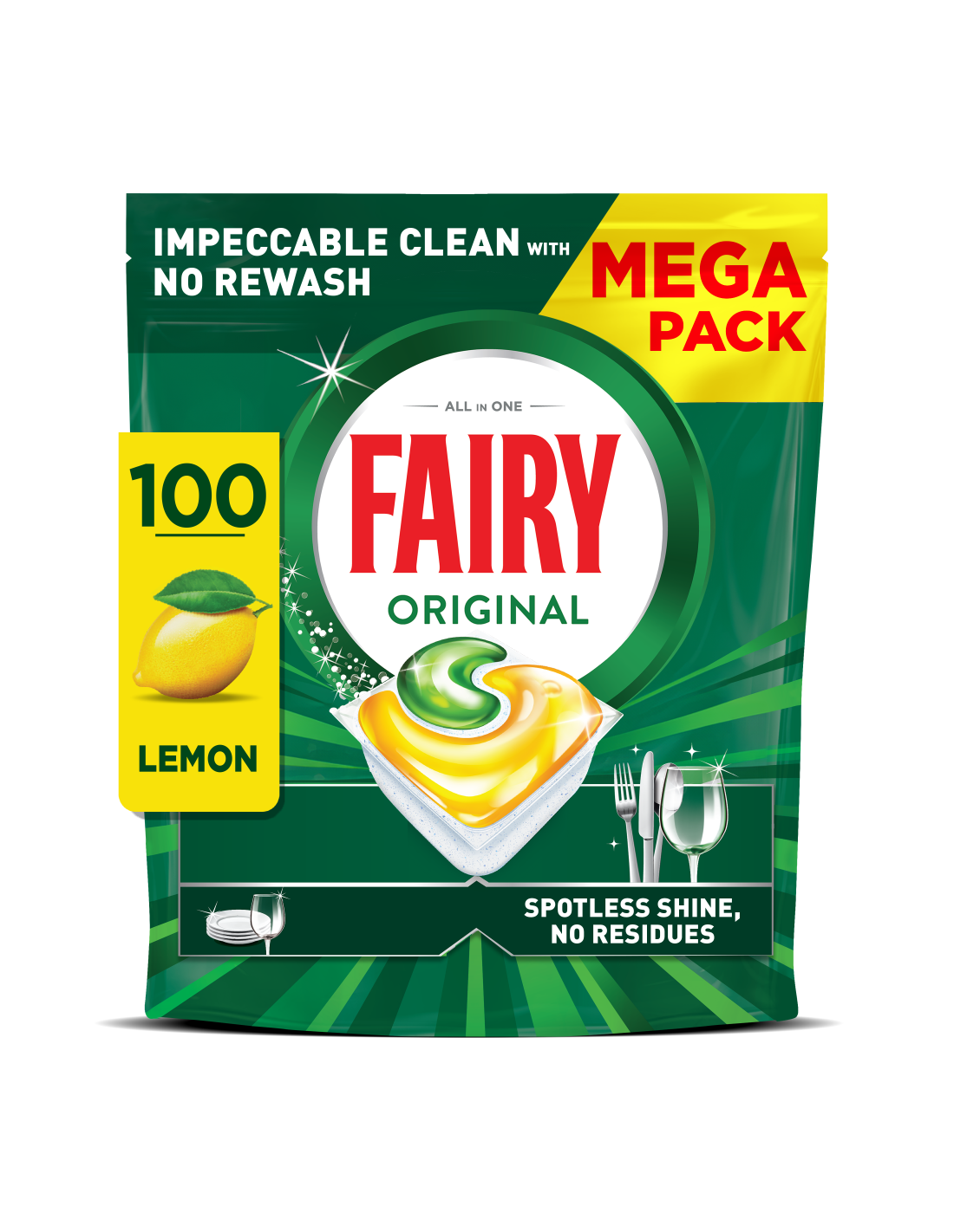 Fairy Original All in One’i nõudepesumasina tabletid pesevad nõud esimese korraga ning on tõhusad isegi kuivanud rasva korral, muutes sinu nõud säravalt puhtaks. Fairy ühendab vedeliku ja pulbri üheks võimsaks kapsliks. Selle ülilahustuv kott lahustub kiirelt nii, et see hakkab töö lõpuleviimiseks kiirelt puhastama. Ja neid on nii lihtne kasutada. Lahtipakkimine pole vajalik, pane need lihtsalt nõudepesumasina pesuaine dosaatorisse.