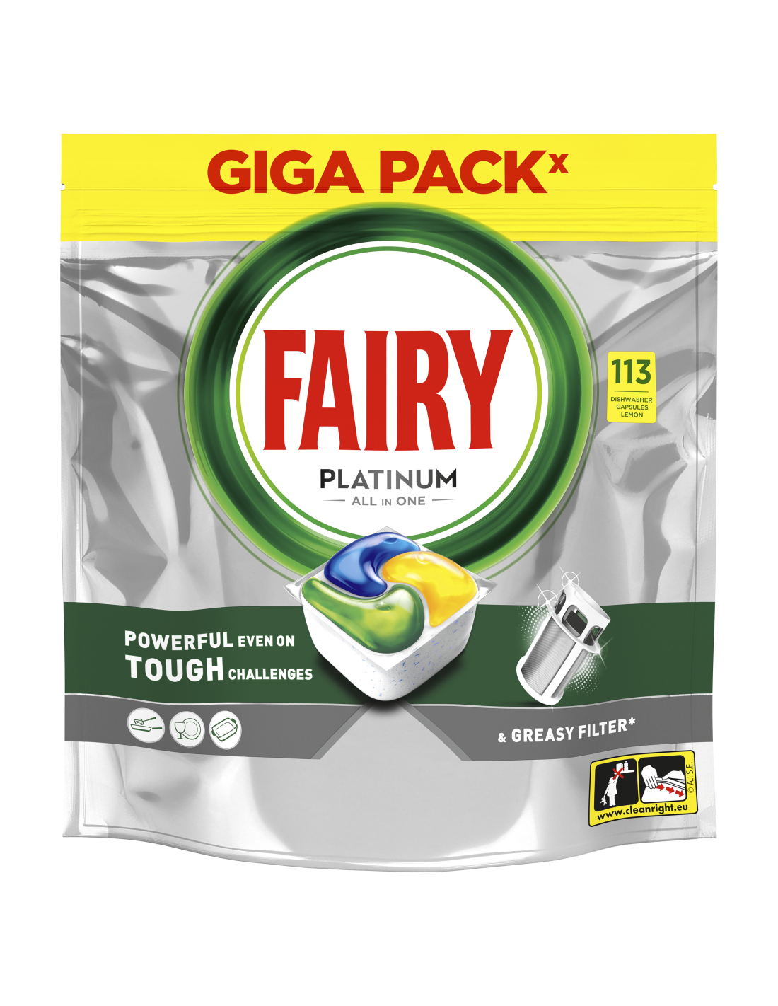 Fairy Platinum All in One’i nõudepesumasina tabletid pesevad nõud esimese korraga ning tulevad toime ka kõige raskemate ülesannetega, muutes sinu nõud säravalt puhtaks. Fairy Platinumil on puhastusjõud, mis annab sulle enesekindluse valmistada mistahes toitu, teades, et see puhastab rasvast isegi masina rasvase filtri ning jätab nõud ja nõudepesumasina säravalt puhtaks. Fairy ühendab vedeliku ja pulbri üheks võimsaks kapsliks. Selle ülilahustuv kott lahustub kiiresti nii, et see hakkab töö lõpetamiseks kiirelt puhastama. Ja neid on nii lihtne kasutada. Lahtipakkimine pole vajalik, pane need lihtsalt nõudepesumasina pesuaine dosaatorisse.