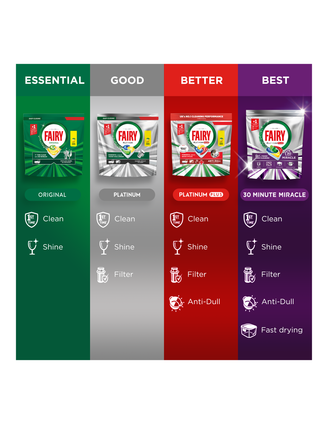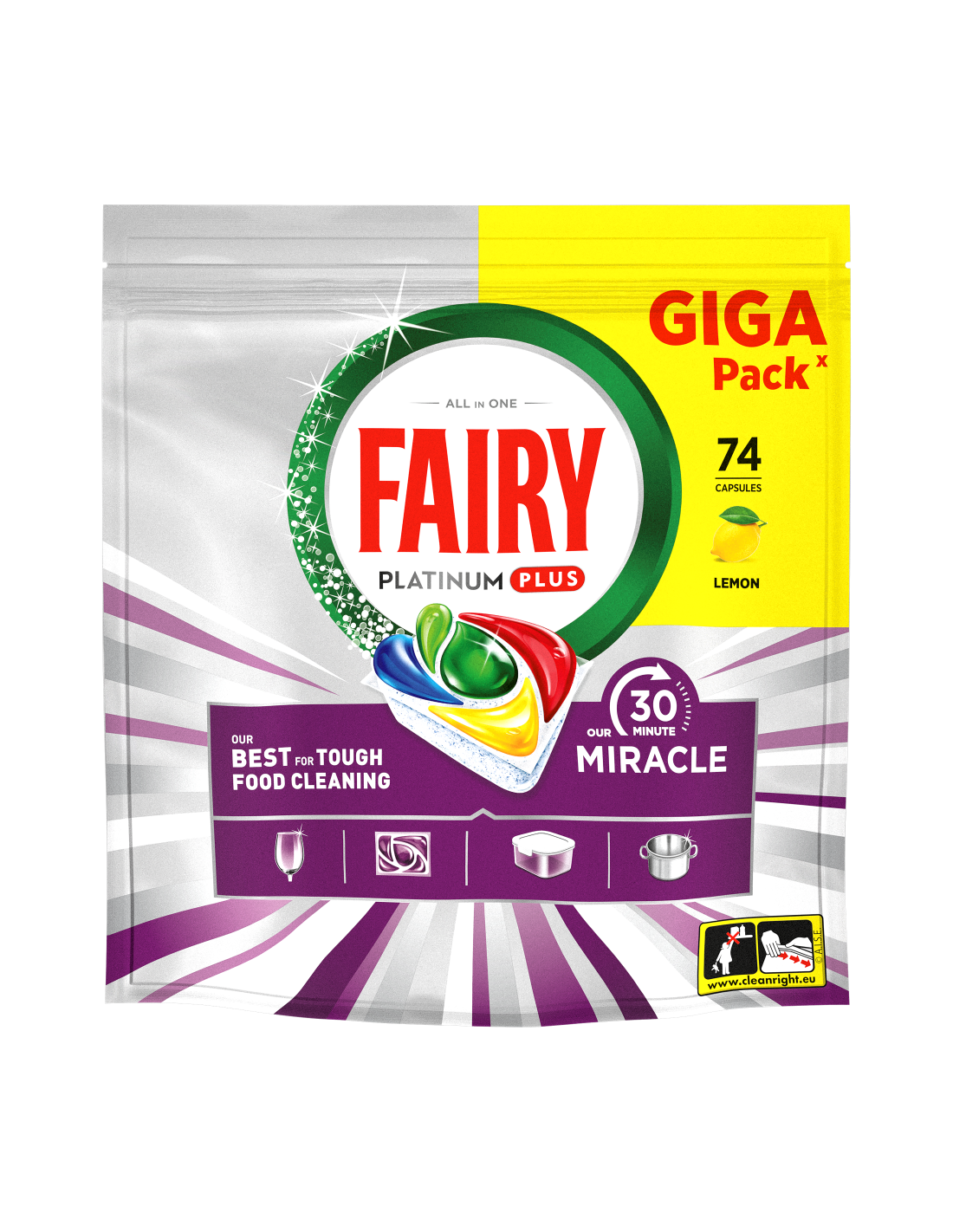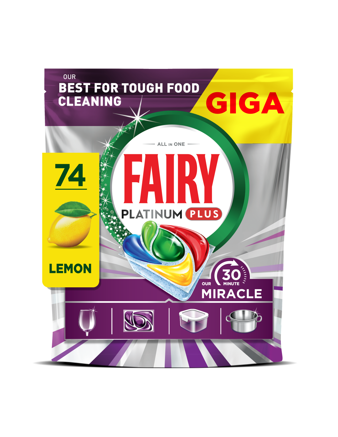 SINU IMELINE KÕIK-ÜHES LAHENDUS LIHTSALT SÄRAVATEKS NÕUDEKS. Avasta Fairy Our 30 Minute Miracle Platinum Plus, meie Nr 1 lahendus tõrksate toidujääkide eemaldamiseks. Need imelised kõik-ühes nõudepesumasina tabletid saavutavad vaevata laitmatu tulemuse isegi lühima pesutsükliga ja jätavad nõudele kerge sidrunilõhna. Viie geeli tõhusus annab säravpuhtad nõud, superläike, kiire kuivamise, rasvase filtri puhastamise ja Tuhmumisvastase Tehnoloogia. Selle kolmekordse toimega rasvaeemaldusained (võrreldes tootega Fairy Original All-in-One) eemaldavad tõrksad toidujäägid kõigest 30 minutiga. Fairy toimib nii pika kui ka lühikese pesutsükliga juba esimesel korral ning eelpesu või järelpesu pole vajalik. Just nagu Fairy nõudepesuvedelik, kuid mugava tableti kujul. Need nõudepesumasina tabletid kõrvaldavad vajaduse kasutada nõudepesumasina soola või nõudepesumasina loputusvahendit. Sobib suurepäraselt hõivatud kodudesse ning pakub kiiret ja laitmatut puhastust, millel on üleöö leotamise toime. Koge Imet ja tervita säravaid tulemusi Fairy 5-kordse puhastusvõimsusega.